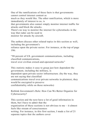 The document discusses the limitations of government control over cyberspace, highlighting challenges such as the difficulty in monitoring data movement and the reliance on private sector infrastructure for cybersecurity. It emphasizes the government's dual role in enhancing cybersecurity while also maintaining surveillance capabilities, as well as the need for collaboration between government and ISPs. The text also outlines various exercise types for cyber incident preparedness, including red team/blue team simulations and penetration testing, and stresses the importance of having resilient communication strategies during cyber attacks.