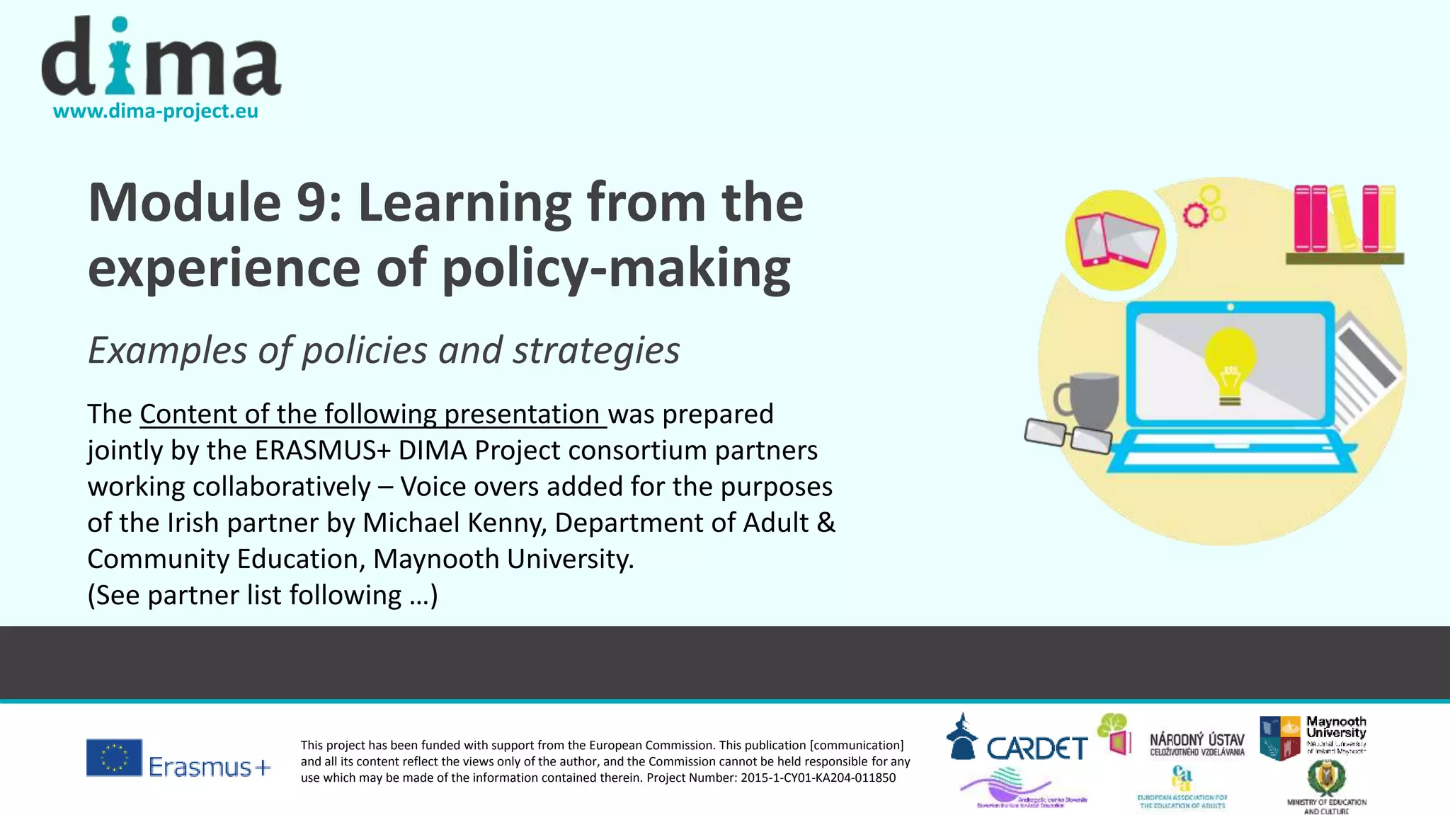 The document outlines Module 9 of the Erasmus+ DIMA project, which focuses on adult education policies and strategies across Europe. It provides insights on critical areas such as outreach, active citizenship, quality assurance, financing, policy dialogue, and policy coherence, showcasing various examples and recommendations from different European countries. The module aims to enhance understanding and implementation of effective adult education policies among stakeholders through collaborative efforts and shared best practices.