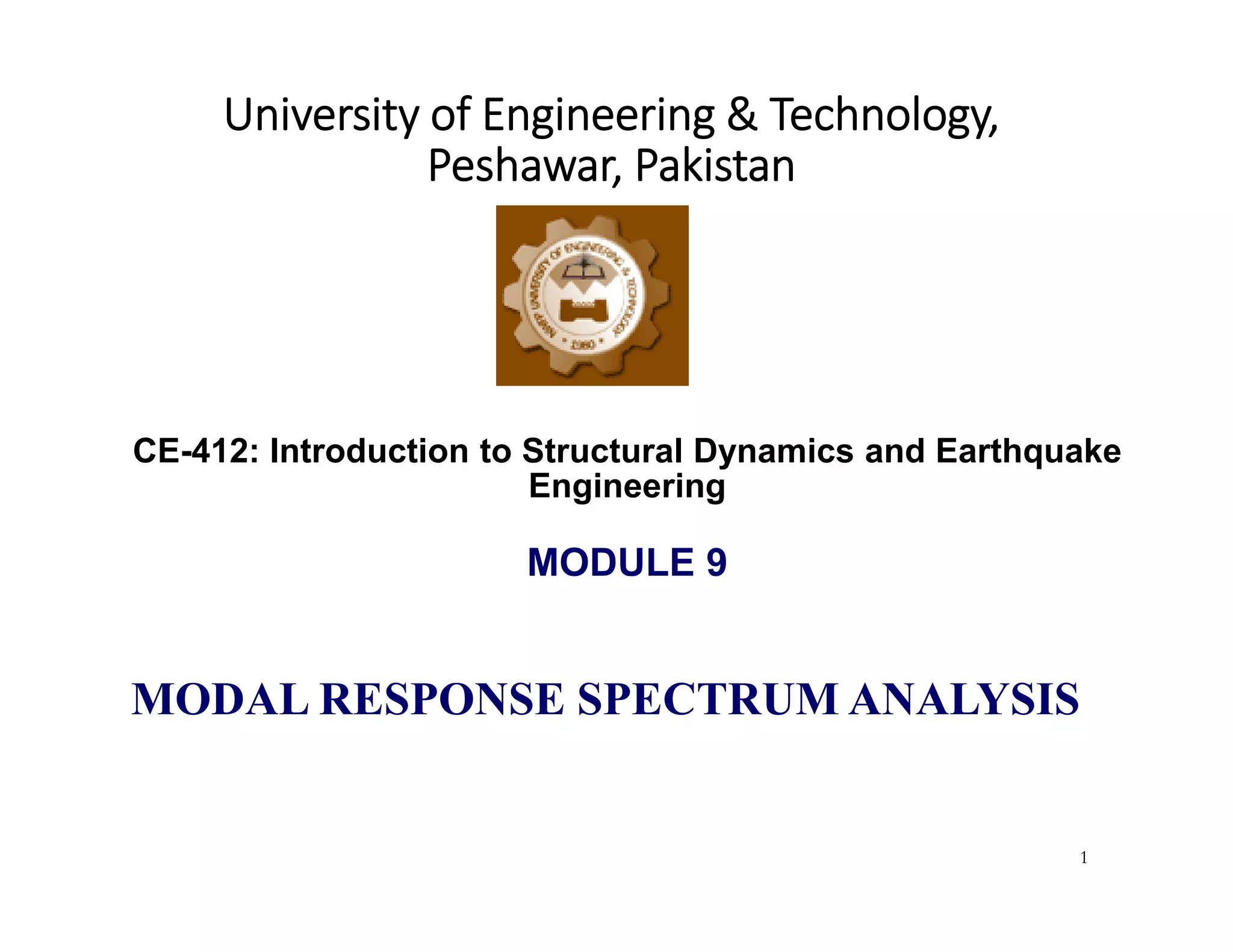 This document discusses modal response spectrum analysis for earthquake engineering. Some key points: