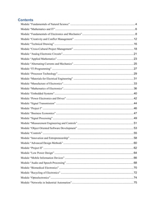 This document describes modules for the Electronics B.Sc. study course. It provides details for 22 modules covering topics such as fundamentals of natural science, mathematics, electronics, mechanics, creativity, technical drawing, project management, analog and digital electronics, programming, embedded systems, signals, and a bachelor thesis. For each module it lists the name, code, courses, semester, coordinator, content, assessment, and literature. The document is a guide for the electronics degree program structure and requirements.
