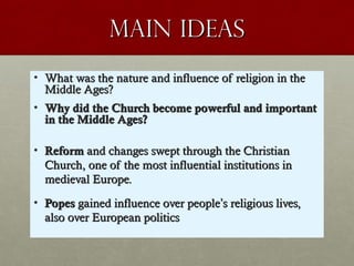The Medieval Church had a powerful influence in medieval Europe for several reasons. The Church became one of the most influential institutions as it provided order, security, and education when governments were weak after the fall of Rome. As the Church grew more powerful in the 11th century, popes gained influence over both religious and political affairs on the continent. They began actively reforming and governing the Church, bringing them into conflict with other leaders, but also increasing their own authority. The Church came to play a central role in both the spiritual and daily lives of medieval Europeans.