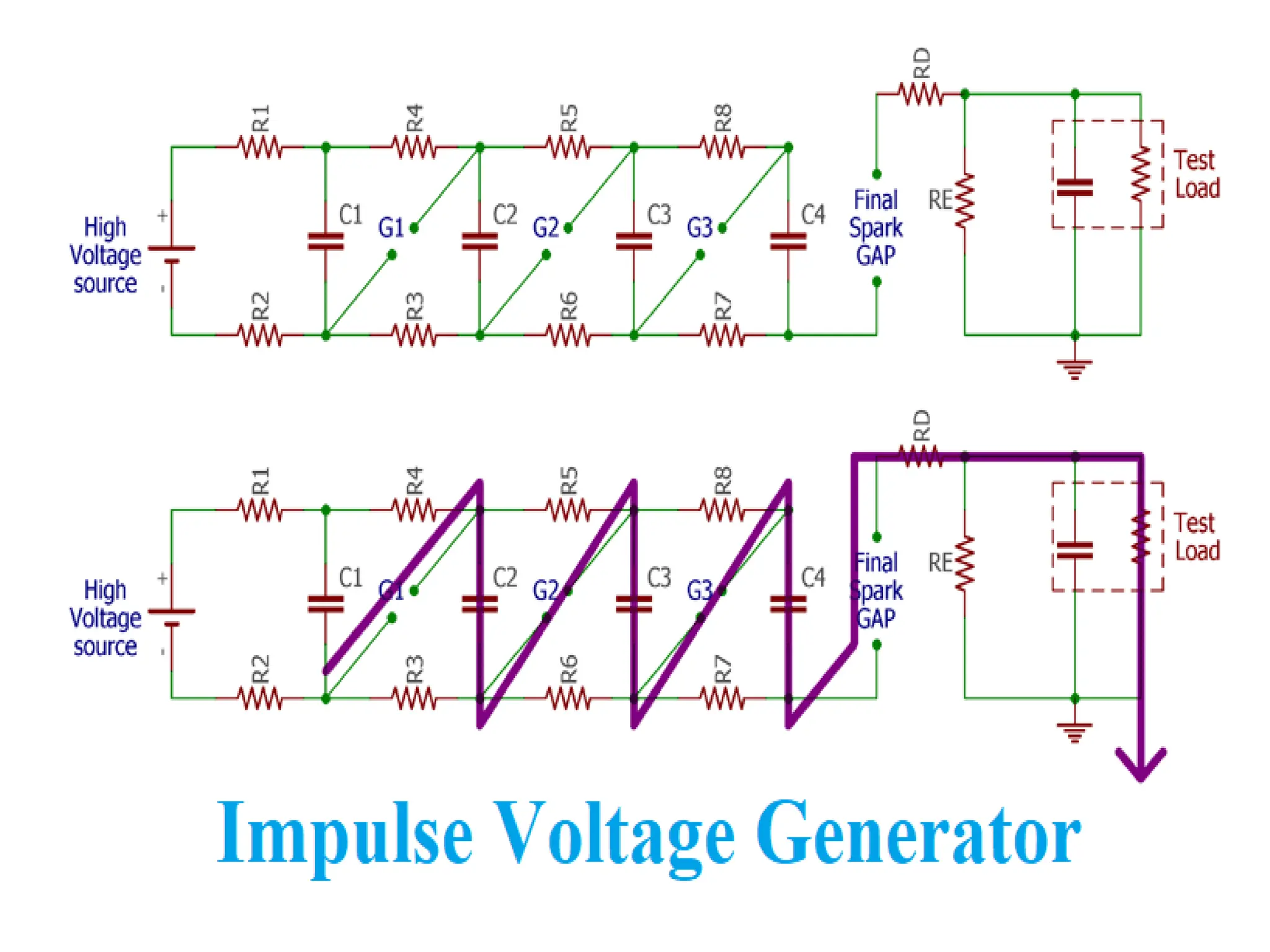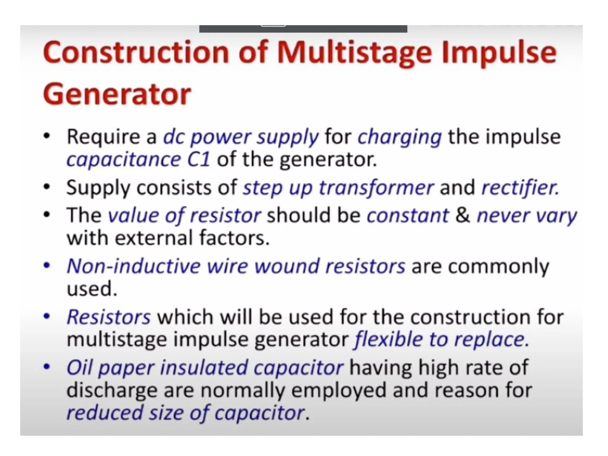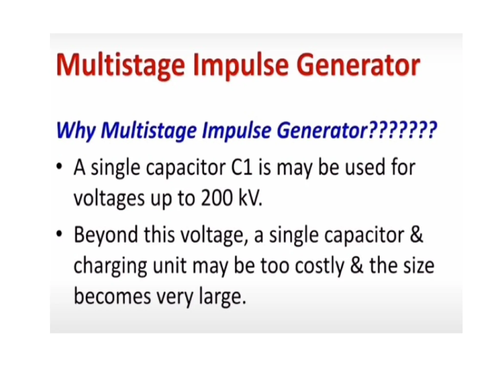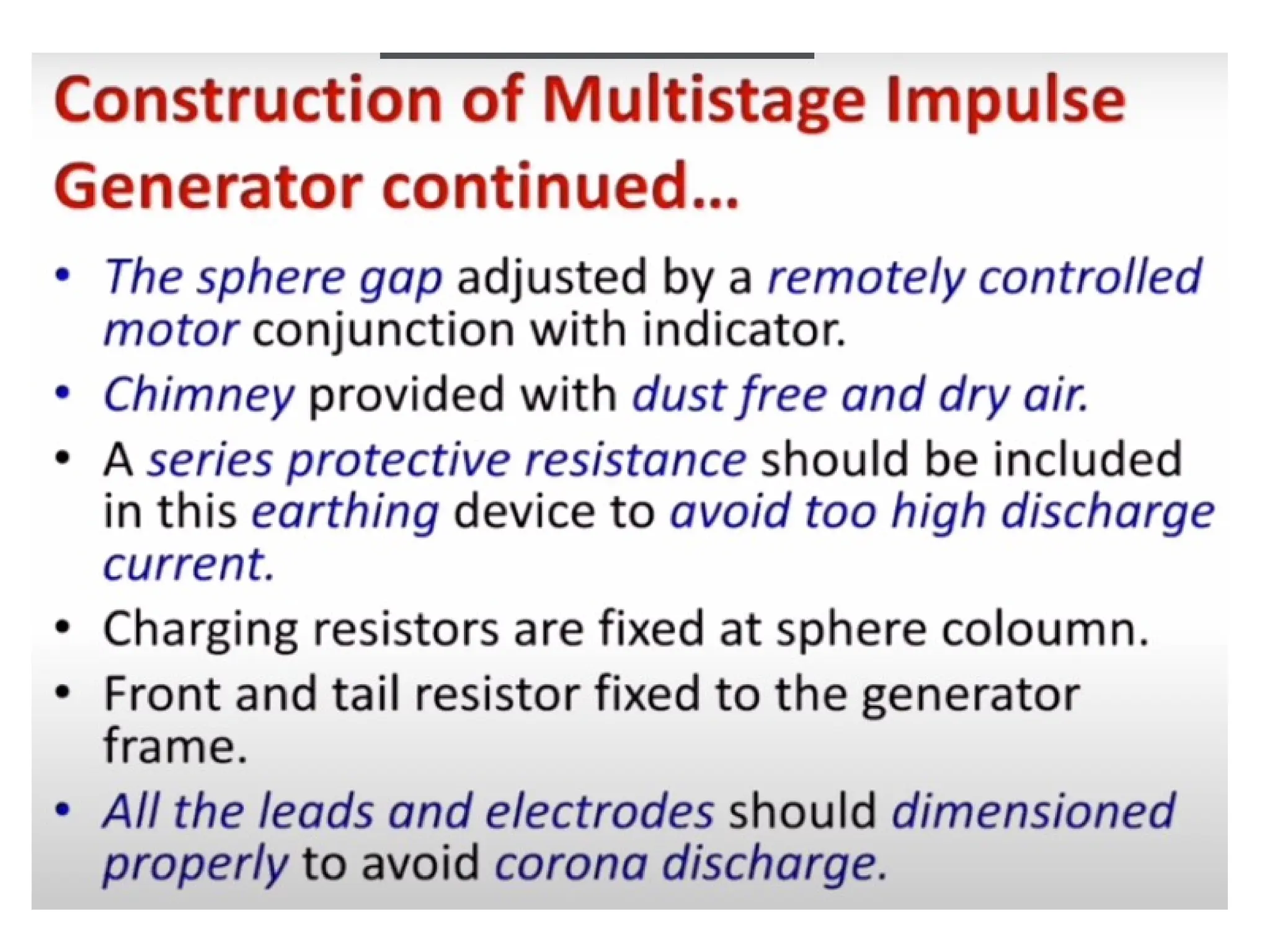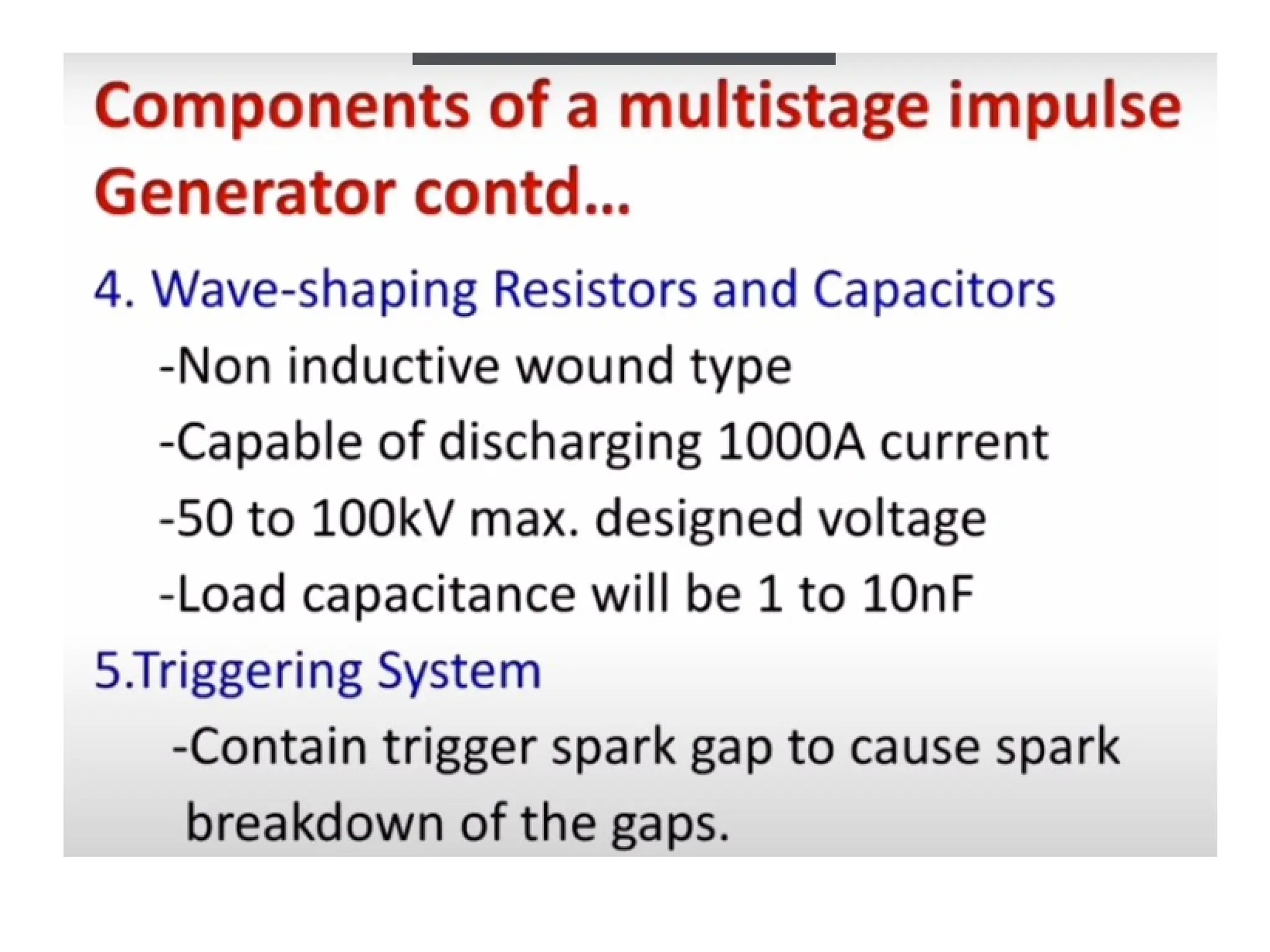 The document discusses the components and configuration of a multistage impulse generator. Key elements include capacitance, charging resistors, spark gaps, and wave shaping resistors. It emphasizes the importance of triggering and synchronization with the test object.