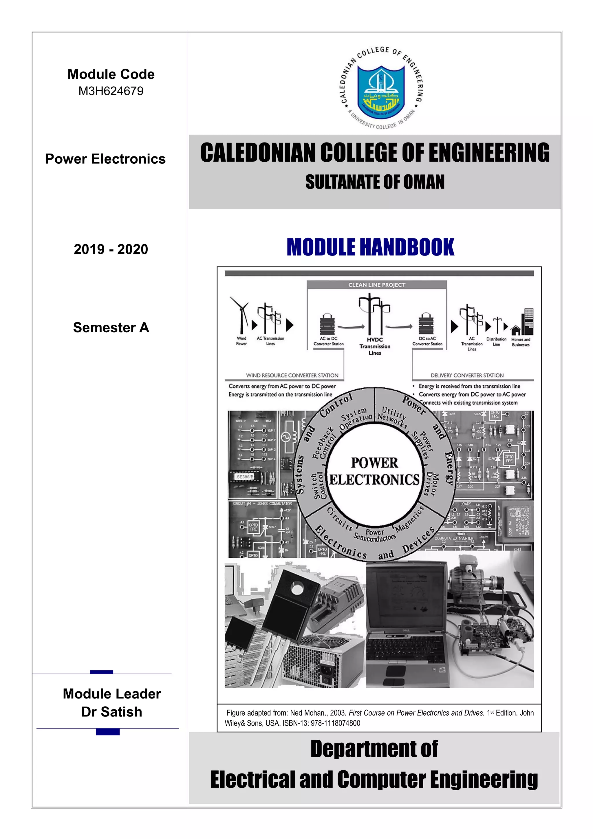 This document provides information about the Power Electronics module offered at Caledonian College of Engineering in Oman for the 2019-2020 academic year. The module is worth 20 credits and intended for third year undergraduate students in Electrical Power Engineering. It will be taught over one semester with 6 contact hours per week, including lectures and tutorials. The module aims to teach students about power electronic devices, circuits, systems and their applications. Key topics covered include rectifiers, inverters, choppers, cycloconverters, thermal protection and applications. Assessment will be based on a mid-term test, coursework in the form of a mini project, and a final examination.