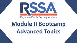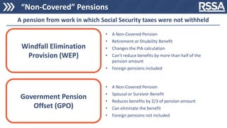 The document provides information about non-covered pensions, the Windfall Elimination Provision, Government Pension Offset, examples of how these provisions impact Social Security benefits calculations, taxation of Social Security benefits, Medicare eligibility and premiums, Medicaid, and enrollment periods for Medicare. It covers advanced topics related to pensions that do not pay into Social Security and how they impact Social Security benefits.