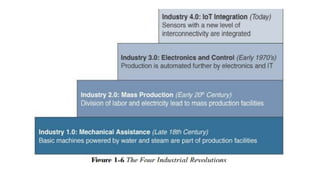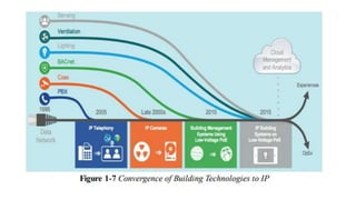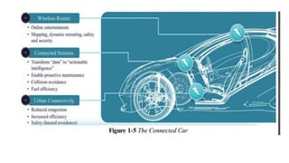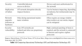 The document discusses Internet of Things (IoT) topics including its genesis, impact, and challenges. IoT connects physical objects through sensors and allows them to exchange data over networks. This enables improvements in efficiency, accuracy, and automation. Examples discussed include connected roadways using sensors to optimize traffic flow, connected factories using real-time sensor data to track production, and smart buildings using digital ceilings integrated with lighting, HVAC, and other systems. Convergence of operational technology (OT) and information technology (IT) brings both opportunities and challenges to securely connect physical systems to digital networks and applications.
