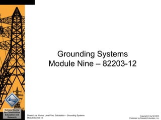The document outlines the objectives and performance tasks related to the grounding systems module for power line workers. Key learning outcomes include understanding ground grid systems, installation methods, safety precautions, and various connection techniques. Visual aids and figures are provided to assist with comprehension and practical application.