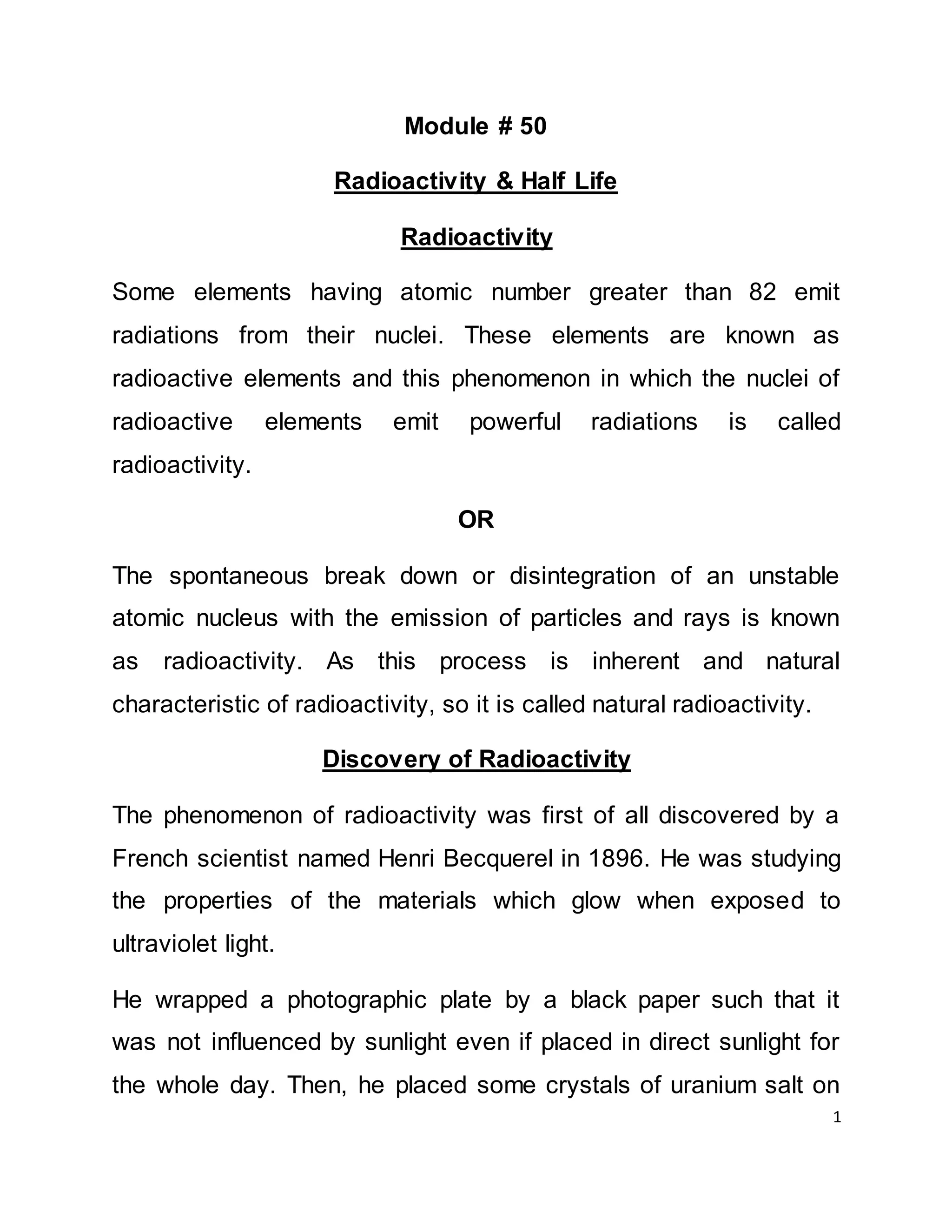 1. Radioactivity is the spontaneous emission of radiation from unstable atomic nuclei. Henri Becquerel discovered radioactivity in 1896 while studying materials that glow under ultraviolet light.