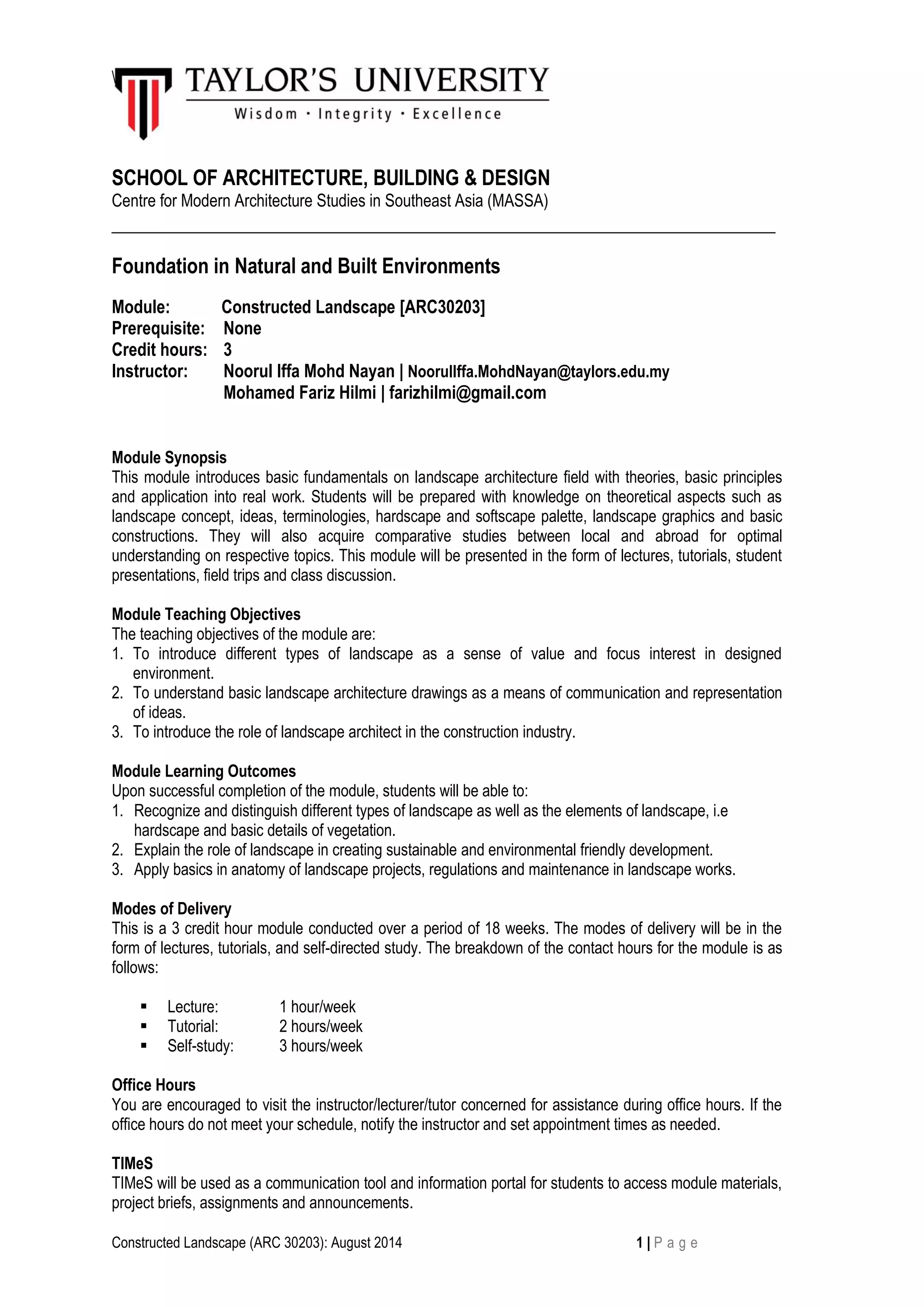 This document provides information about the Constructed Landscape module, including its objectives, learning outcomes, teaching methods, and assessment plan. The module introduces students to landscape architecture through lectures, tutorials, field trips, and class discussions. It aims to help students understand different landscape types and drawings, as well as the role of landscape architects. Students will be assessed through participation, presentations, and a portfolio to evaluate their understanding of landscape elements, sustainability, and project implementation.