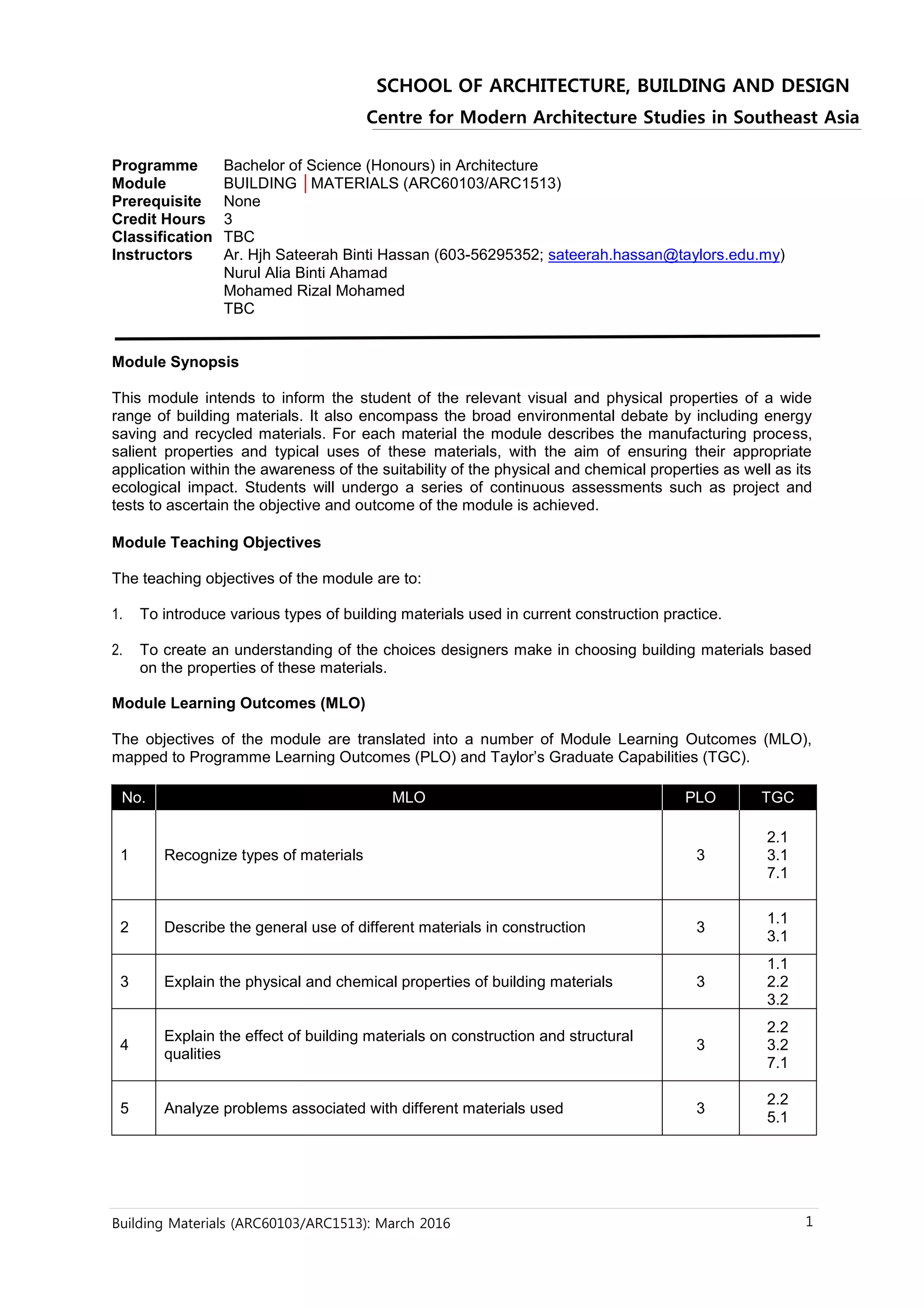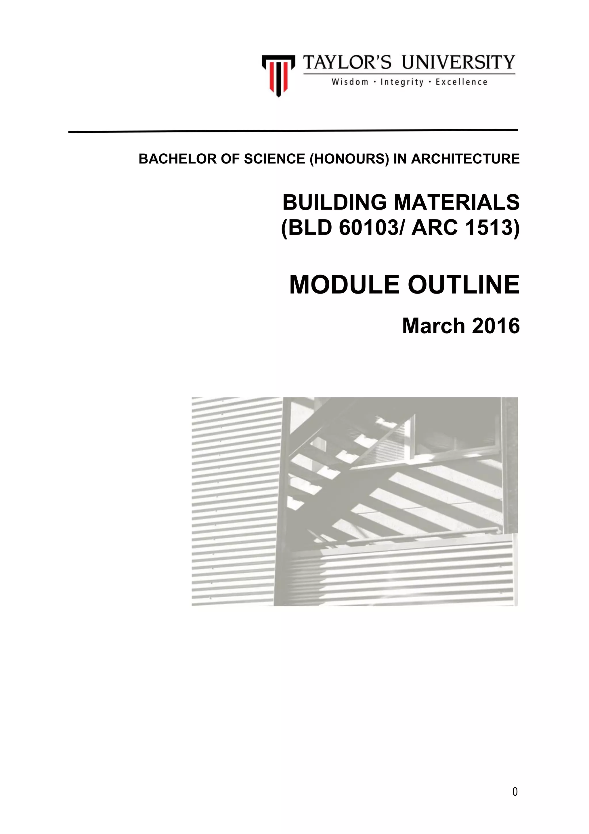 This document outlines a module on building materials for a Bachelor of Science in Architecture program. It includes information on instructors, module synopsis, teaching objectives, learning outcomes, assessment components, schedule, and general rules. The key points are: