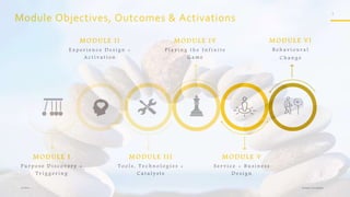The document outlines a framework for integrating purpose, customer and employee experience, and behavioral change through a series of modules focused on discovery, design, and implementation. It emphasizes understanding the business case for purpose, designing transformative experiences, and applying behavioral economics to drive long-term organizational success. The goal is to create a purpose-driven company that aligns strategic resources while balancing short-term pressures.