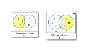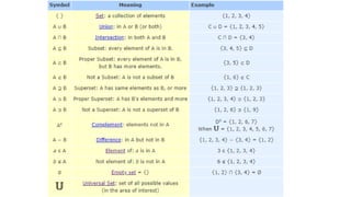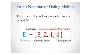 This document discusses the concept of sets, defining them as collections of objects, or elements. It covers different methods of representing sets including roster, set-builder notation, and verbal descriptions, as well as operations on sets like union, intersection, complement, and difference. Additionally, it describes classifications of sets, such as finite vs infinite, and provides examples along with symbols used in set theory.