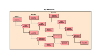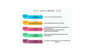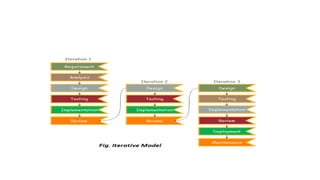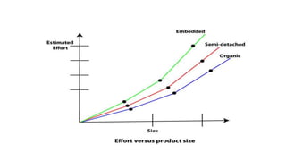 The document discusses various software development models including waterfall, RAD, spiral, V-model, incremental, agile, iterative models. It provides details on when each model should be used, advantages and disadvantages of each model. It also discusses software quality management, ISO 9000 certification, CMMI, six sigma and various software project planning topics like cost estimation models, COCOMO model etc. The key project planning activities covered are software estimation, scheduling, monitoring and risk management.