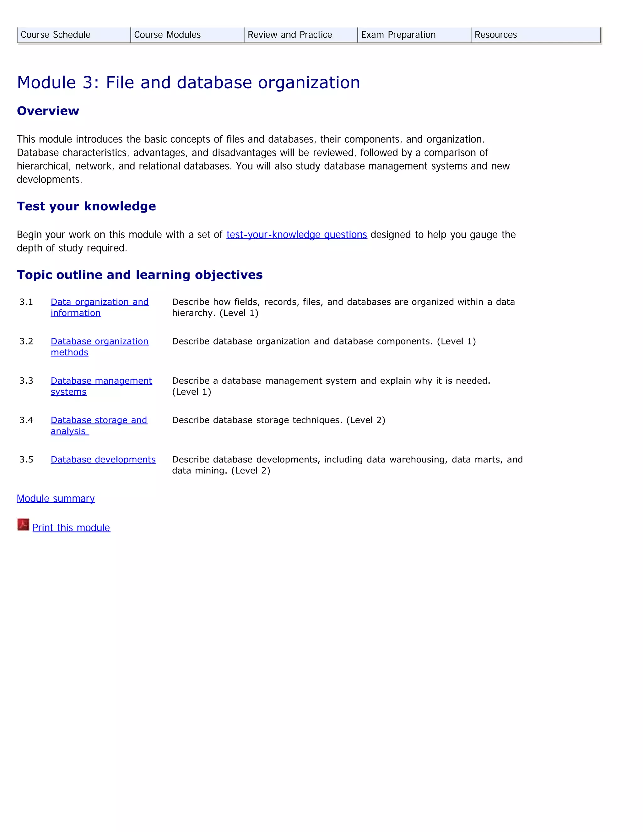 This module introduces concepts related to file and database organization. It describes how data is organized in a hierarchy from characters to fields, records, files, and databases. It then discusses different database organization methods like hierarchical, network, and relational models. It also describes what a database management system is and why it is needed to create and manage databases. The key aspects covered are data modeling and organization, database components, and the role of a DBMS.