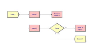 This document provides an overview of a module on the Arena computer simulation language. It discusses upcoming topics that will be covered, including an introduction to Arena, the basic process template, create-process-dispose modules, details on the process module, and resource, schedule, and queue spreadsheets. The goal is to learn the basics of Arena and build initial simulations using the basic process template and its modules.