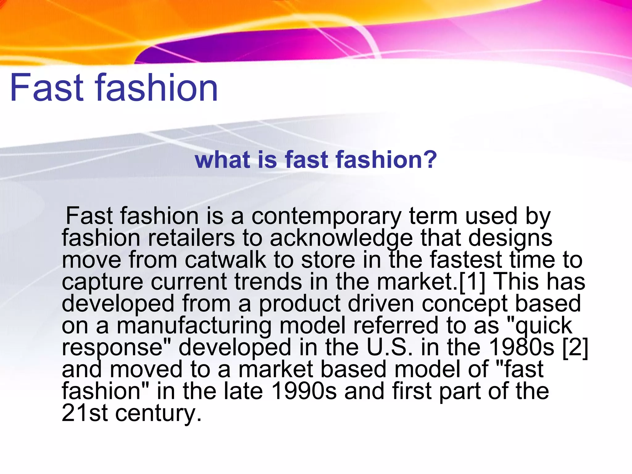Fast fashion refers to trendy clothing designs that move quickly from catwalk to stores to capture emerging fashion trends. Major retailers like Zara, H&M, and Topshop practice fast fashion by designing and manufacturing clothing quickly and cheaply. Zara can produce a new product in just two weeks compared to the industry average of six months. It has its own factories and controls much of the supply chain internally unlike competitors that outsource manufacturing. H&M designs clothing in Sweden and outsources production to over 800 factories in Europe and Asia. Marketing is key to fast fashion by promoting consumption of new designs and creating more short-lived buying seasons.