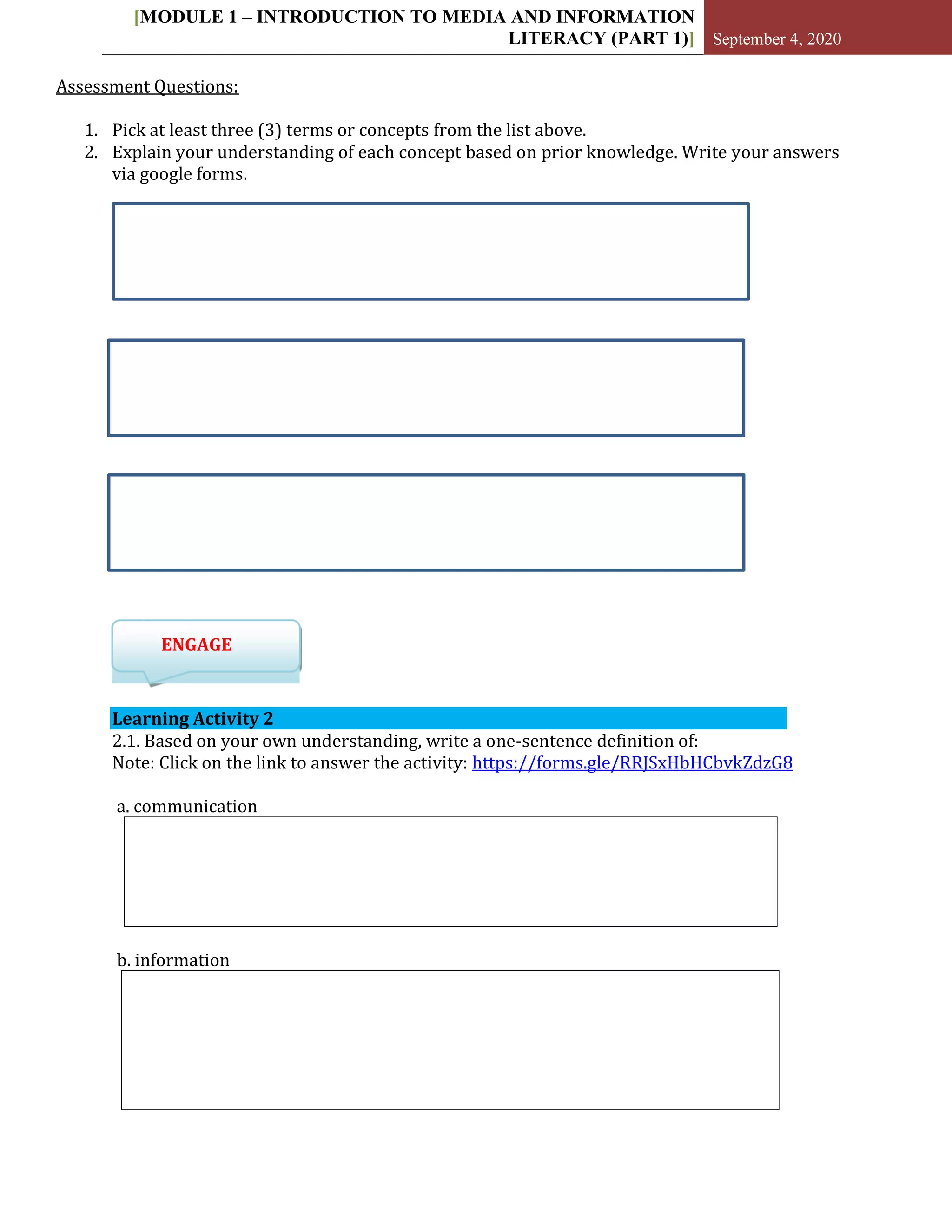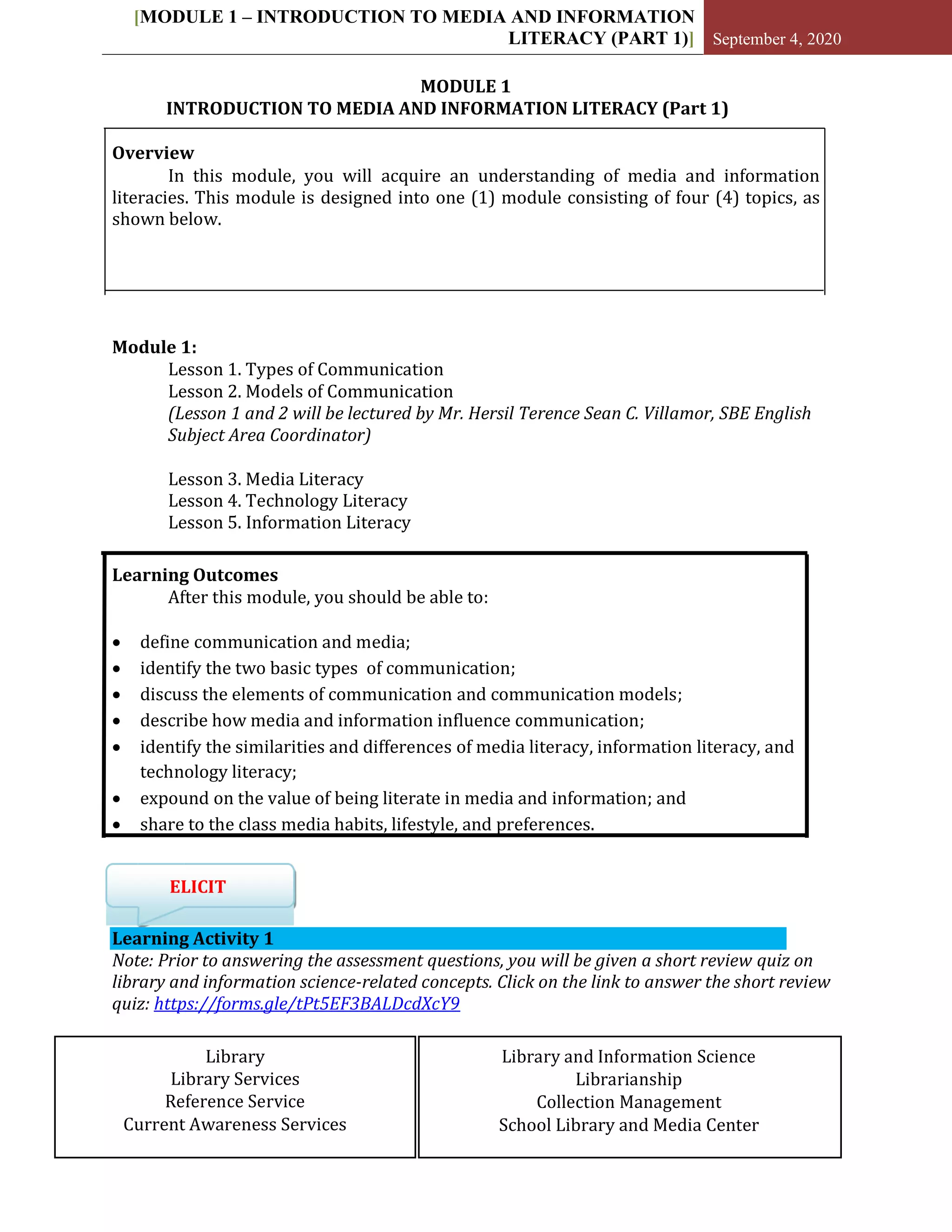 This document provides an overview of Module 1 of a course on media and information literacy. The module aims to provide an understanding of media and information literacies and is divided into 5 lessons covering types of communication, models of communication, media literacy, technology literacy, and information literacy. Key learning outcomes include being able to define communication and media, discuss elements of communication models, and identify the similarities and differences between media, information, and technology literacy. The document also outlines several classic models of communication, including the Lasswell, Shannon-Weaver, Osgood-Schramm, Westley and Maclean, and Berlo models.