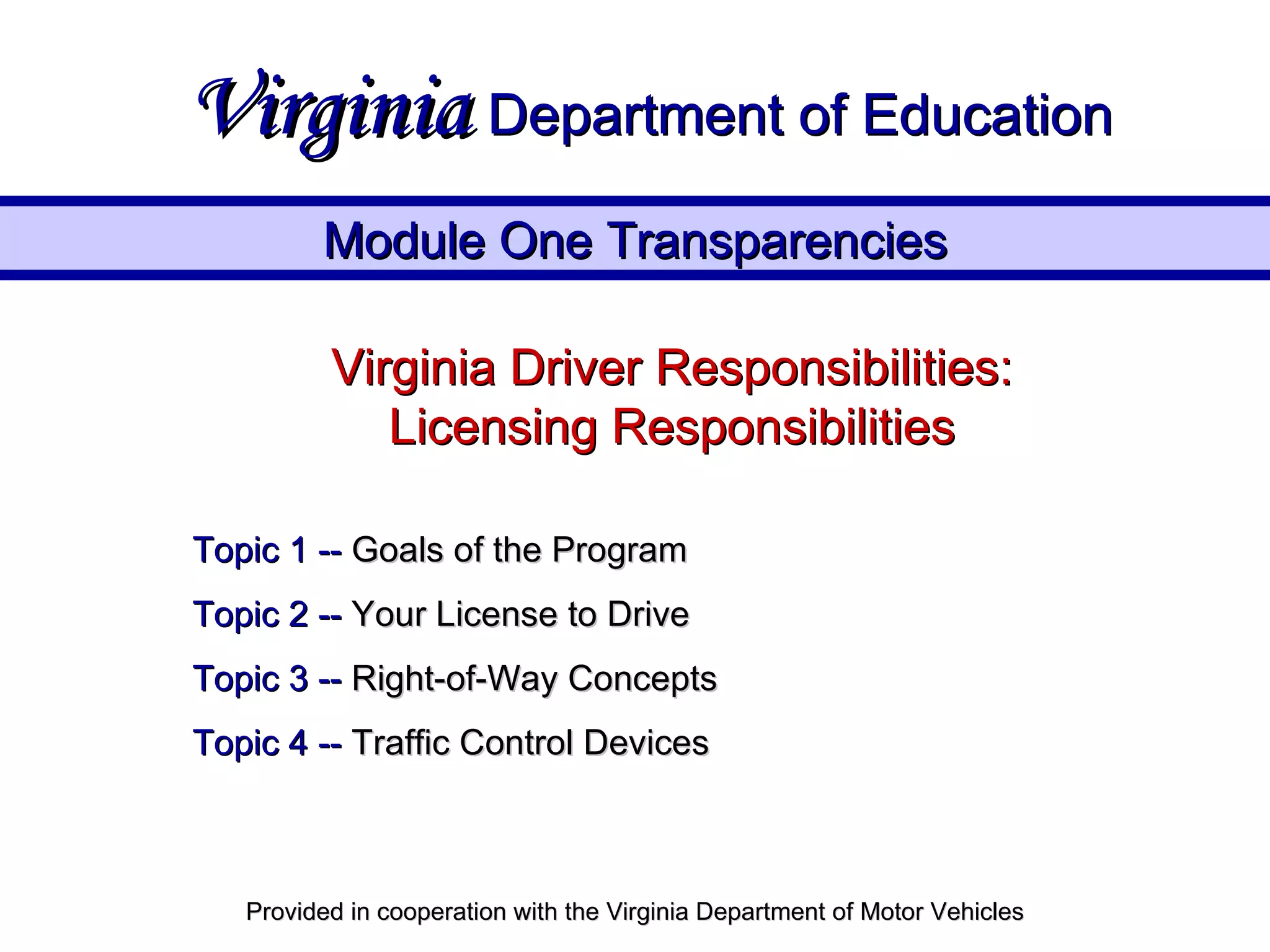 This document summarizes information from a Virginia driver's education program about driver licensing responsibilities, the right-of-way concept, and traffic control devices. It discusses the goals of driver education, types of Virginia licenses and their requirements, rules of right-of-way at intersections, railroad crossings, and for pedestrians and emergency vehicles. It also describes various traffic signs including warning, regulatory, guide and information signs as well as traffic light signals.