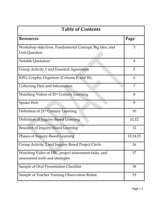 The document provides materials for a teacher training workshop on inquiry-based learning for 21st century education. It includes objectives to help teachers develop understandings of 21st century learning and apply inquiry-based learning methods. The document outlines phases of inquiry-based learning and provides sample tools for assessing student projects and observing teacher training.