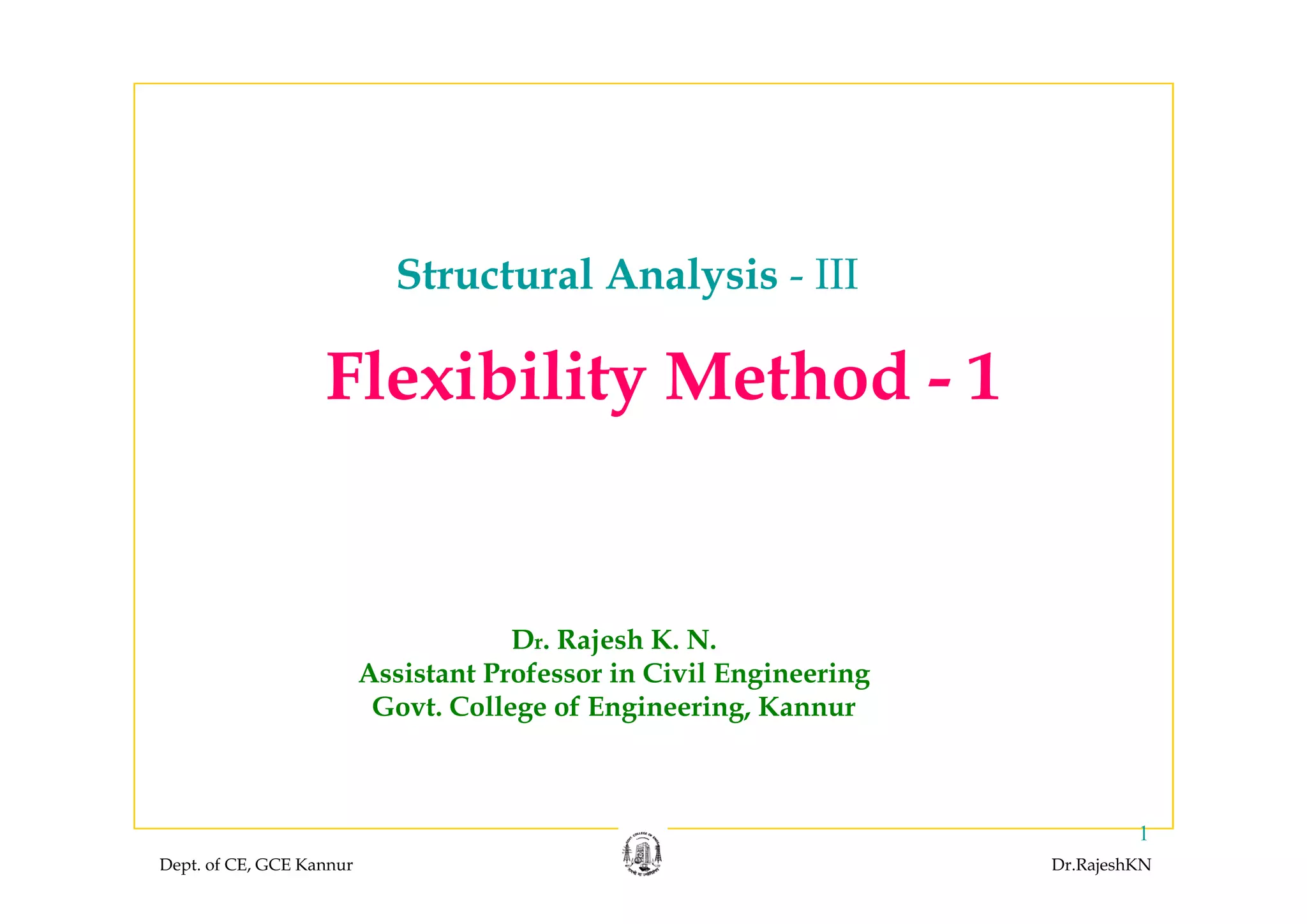 This document discusses the flexibility method for structural analysis. The flexibility method involves determining flexibility coefficients by applying unit loads corresponding to redundant forces and calculating the resulting displacements. These flexibility coefficients are then used to calculate the redundant forces needed to satisfy compatibility conditions. The flexibility matrices for different structural elements are developed. Joint displacements, member end actions, and support reactions can be determined by incorporating the flexibility coefficients into the basic computations. Examples are provided to illustrate the flexibility method for a continuous beam with one redundant and for determining various outputs like redundants, joint displacements, and reactions.