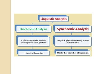 This document provides an overview of the key concepts in historical linguistics. It defines historical linguistics as the study of language change over time. The main concerns of historical linguistics are to describe and account for language changes, reconstruct pre-histories of languages, develop theories of language change, describe the history of speech communities, and study etymology. It also outlines tools for studying language change, specific areas of change, evidence of change, and dispels common myths about language.