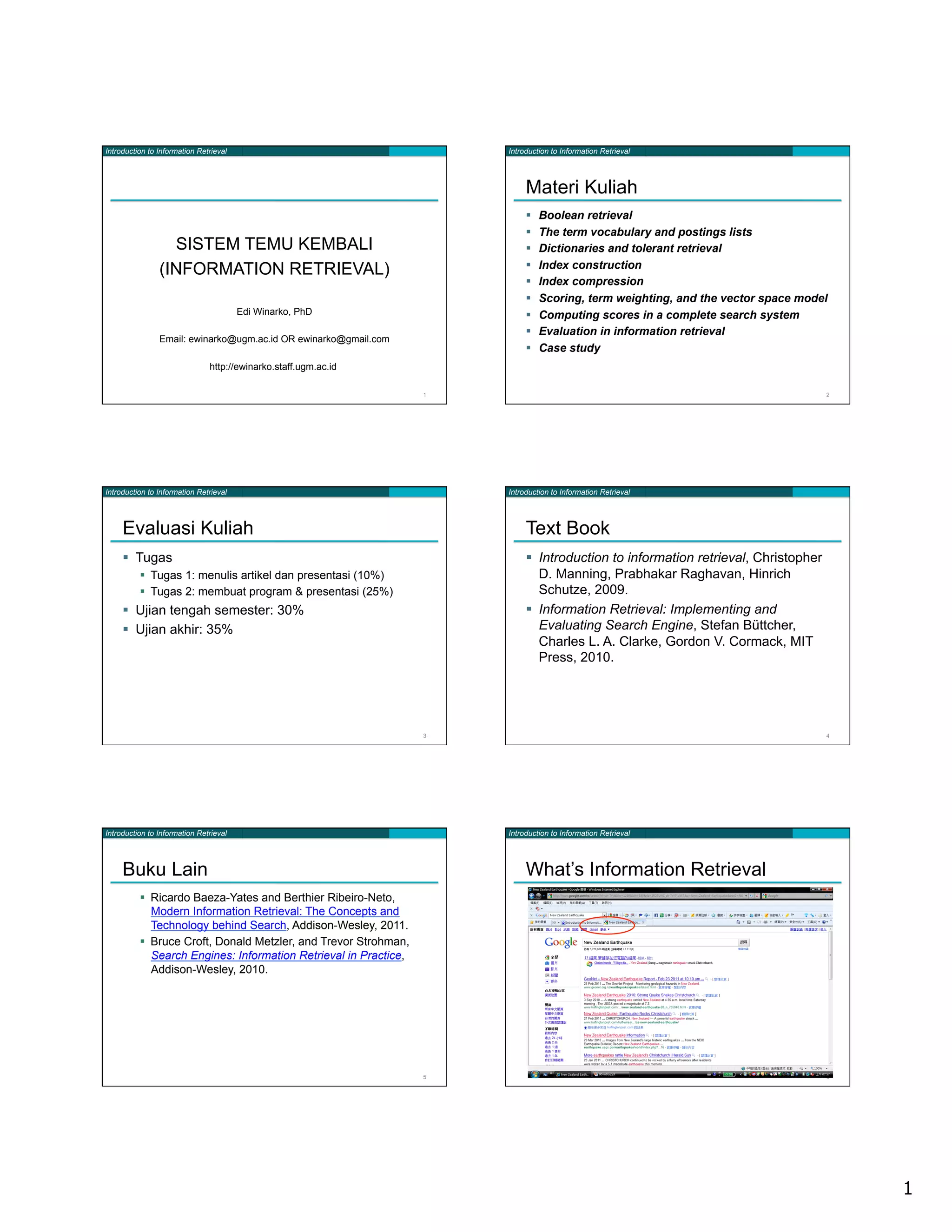 This document outlines the topics and materials for an introduction to information retrieval course. The topics covered in the course include Boolean retrieval, index construction, term weighting models, evaluation methods, and case studies. Students will be evaluated based on assignments, a midterm exam, and a final exam. The course recommends two textbooks and provides additional references on information retrieval systems like Wikipedia, Google Maps, Google News, and blogs.