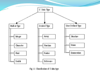 An algorithm is a defined procedure for problem-solving, consisting of logical steps that produce outputs from specified inputs, while flowcharts visually represent these steps in a diagrammatic format. Algorithms and flowcharts each have unique advantages, such as effective communication and structured programming, but also come with limitations like complexity and difficulty in modifications. The document discusses structured programming concepts, the differences between top-down and bottom-up approaches, and provides a comprehensive overview of programming in C language including data types, constants, and memory management.