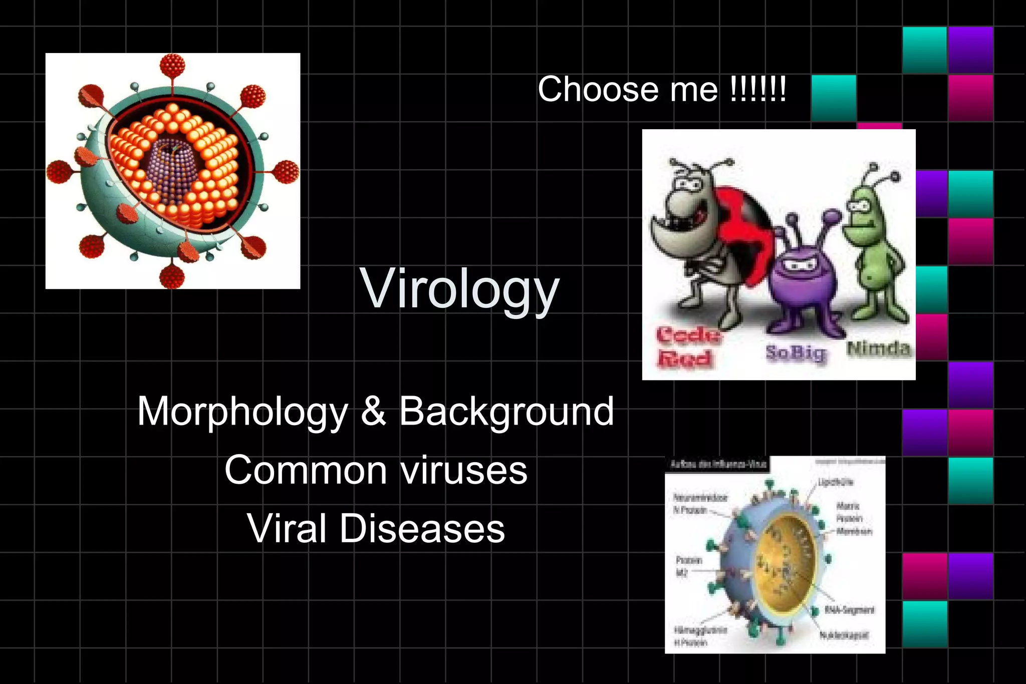 This document provides information on viruses including their structure, classification, life cycle, and diseases they cause. It defines key terms like capsids, genomes, and envelopes. It describes the four main types of viral structures and how viruses are classified based on attributes like morphology, genome, and host. Common animal viruses are outlined including families like Adenoviridae, Flaviviridae, and Picornaviridae. Public health issues like influenza, SARS, Ebola, and dengue are also summarized.