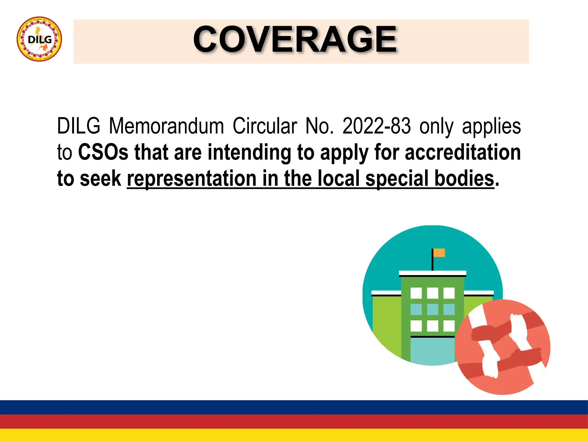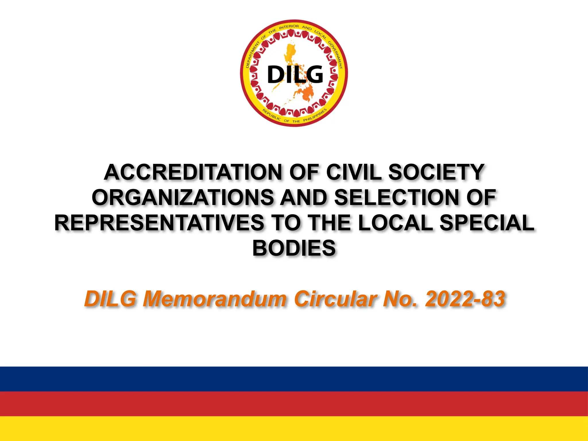 The document outlines the process for accrediting civil society organizations (CSOs) and selecting their representatives to local special bodies in the Philippines according to DILG Memorandum Circular No. 2022-83. It details the major activities in the accreditation schedule including conducting an inventory of CSOs, updating directories, and calling for accreditation applications. It lists the requirements for accreditation and the steps for evaluation and selection of representatives. The local special bodies that CSO representatives can be selected for include the Local Development Council, Local Health Board, and Local School Board.