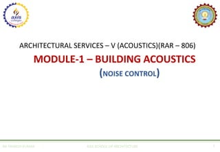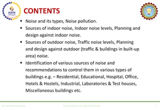 The document discusses various aspects of building acoustics, focusing on noise control for different types of buildings such as residential, educational, hospitals, offices, and hotels. It categorizes noise into air-borne, structure-borne, and inside noise, identifying sources and providing recommendations for minimizing undesirable sound through effective planning, design, and use of sound insulating materials. It highlights the importance of adhering to acceptable noise levels and suggests specific strategies tailored to mitigate noise pollution in diverse environments.