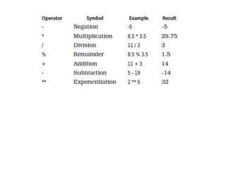 Python is an interpreted scripting language created in 1991 by Guido van Rossum. It is useful for small to medium sized projects and is used by many companies like Google, Yahoo, and YouTube. Python can be installed on Windows, Mac OS, and Linux operating systems by downloading the appropriate version from its website. It is an interpreted language, meaning code is executed directly without compilation. Python uses static typing where the type of a value determines how it behaves in expressions. It provides many built-in functions for common operations like math, converting between types, and rounding numbers. Functions allow code reuse and make programs more readable.