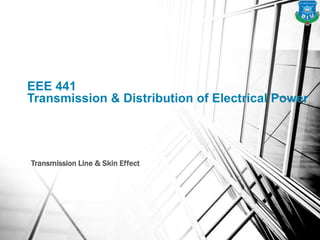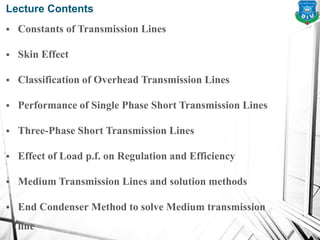 The document discusses the transmission and distribution of electrical power, focusing on key concepts such as line constants (resistance, inductance, and capacitance), skin effect, and voltage regulation in transmission lines. It categorizes transmission lines into short, medium, and long based on their length and voltage and outlines the performance impacts of load power factor on efficiency and regulation. It aims to equip students with formulas and methodologies for analyzing transmission systems effectively.