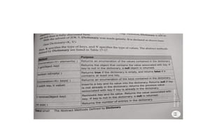 The document details various Java collection classes, including AbstractCollection, AbstractList, AbstractSet, HashSet, LinkedList, ArrayList, and TreeSet, alongside their corresponding features and example code. Each class provides specific functionalities for managing groups of objects, supporting operations such as adding, removing, and iterating over elements. The document also introduces Map interfaces and their implementations, highlighting key operations and characteristics of different map types.