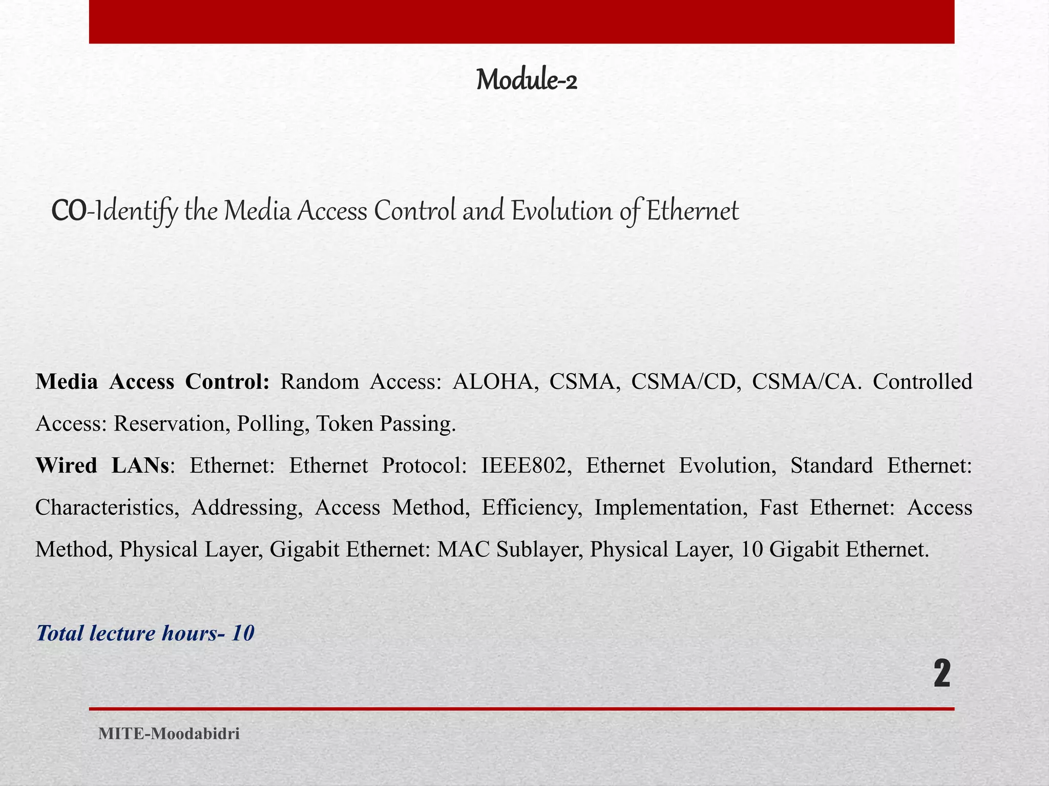 This document discusses media access control and the evolution of Ethernet. It covers random access methods like ALOHA, CSMA, CSMA/CD, and CSMA/CA. It also discusses controlled access methods like reservation, polling, and token passing. The document then covers the evolution of Ethernet including standard Ethernet, Fast Ethernet, Gigabit Ethernet, and 10 Gigabit Ethernet. It describes aspects like their addressing, access methods, frame formats, and physical layers.