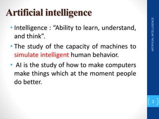 The document discusses various search algorithms used in artificial intelligence problem solving including uninformed searches like breadth-first search and depth-first search, as well as informed searches like uniform-cost search, greedy best-first search, and A* search. It provides analysis of the time and space complexity, completeness, and optimality of these search strategies. Examples of problems that can be modeled as state space searches are presented, such as the 8 queens puzzle, tower of Hanoi, and game playing.