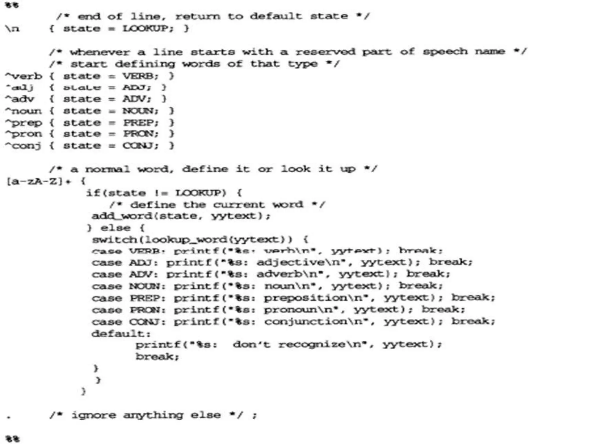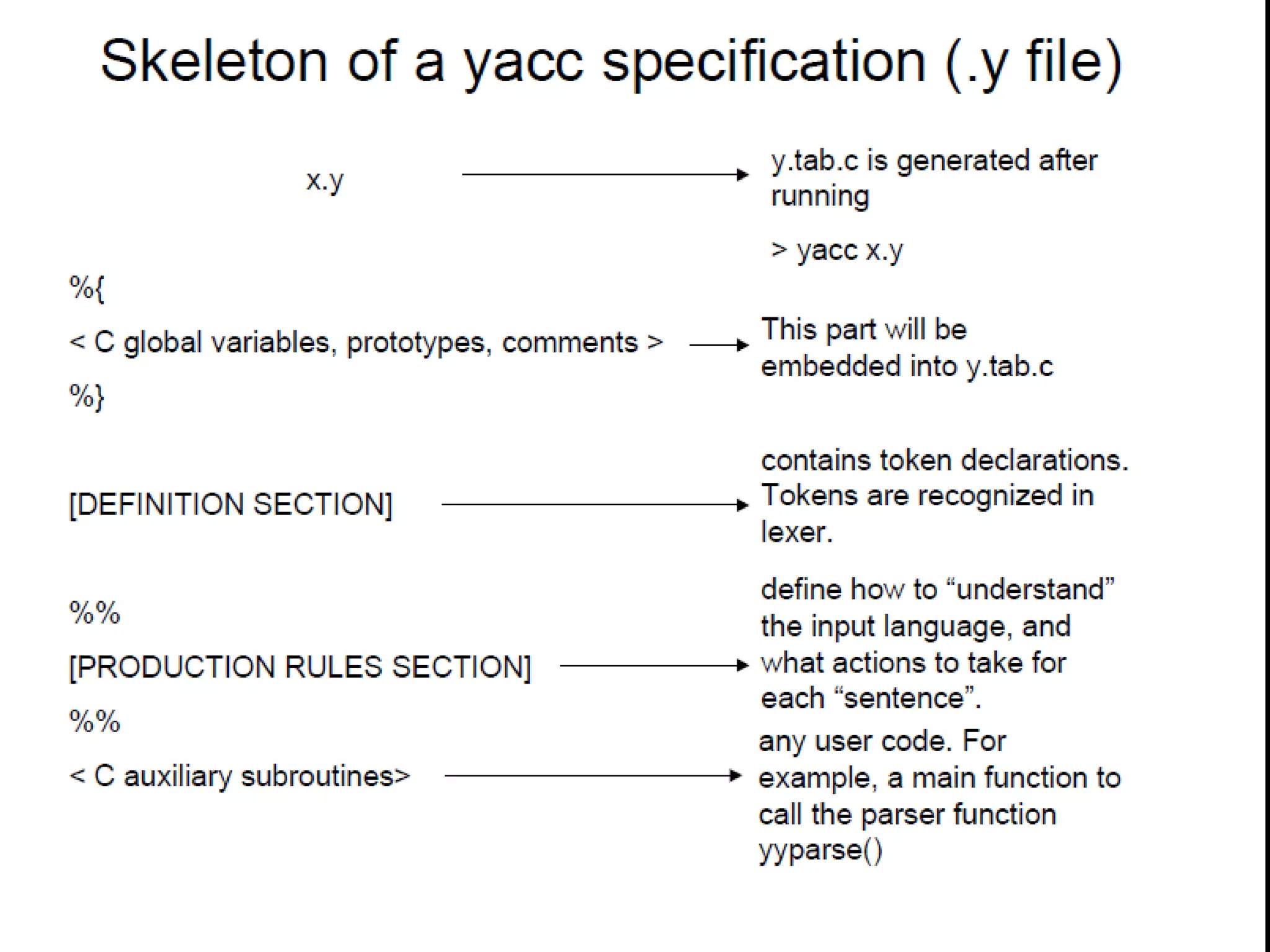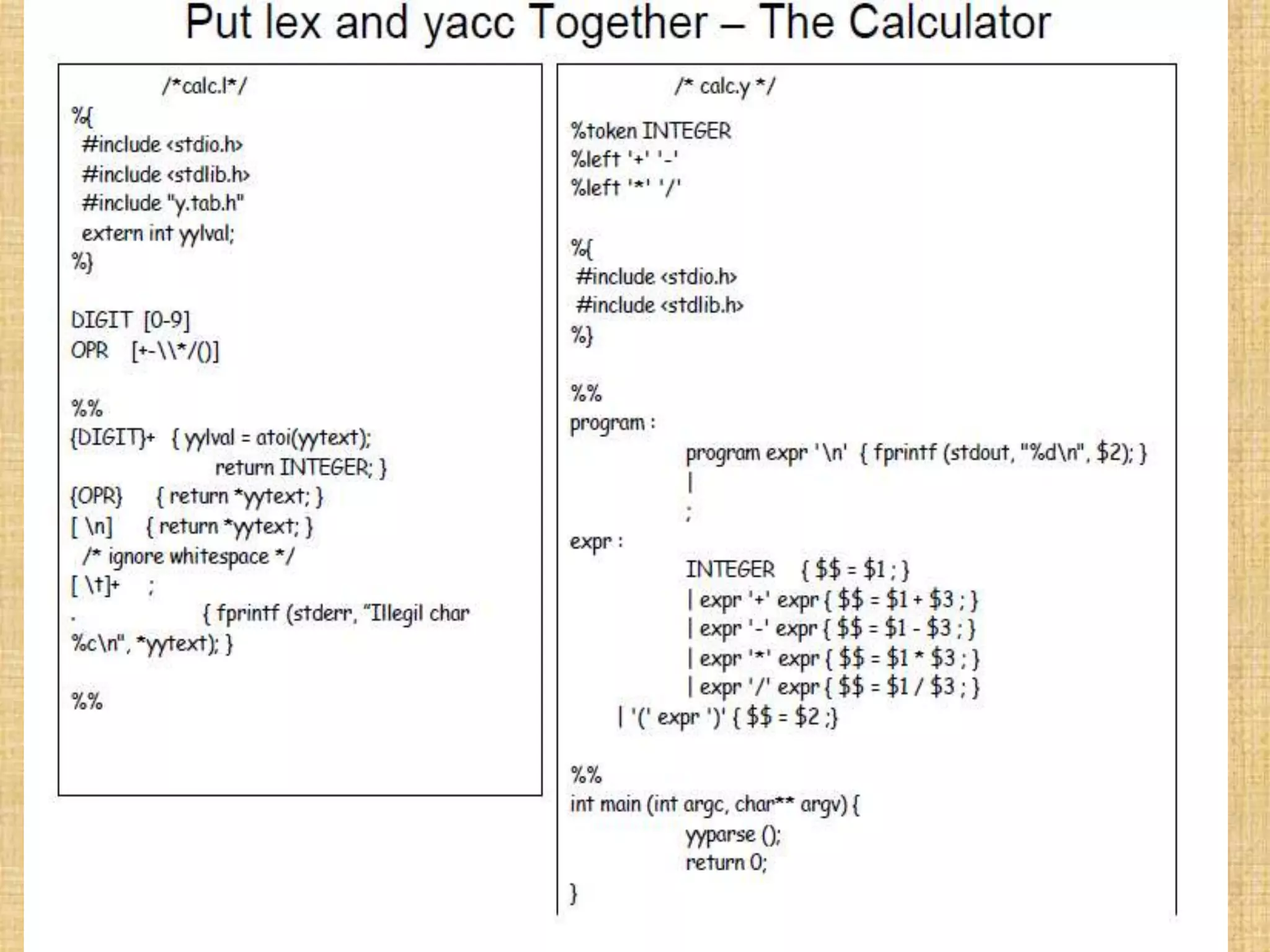 Lex and Yacc are compiler-writing tools that are used to specify lexical tokens and context-free grammars. Lex is used to specify lexical tokens and their processing order, while Yacc is used to specify context-free grammars for LALR(1) parsing. Both tools have a long history in computing and were originally developed in the early days of Unix on minicomputers. Lex reads a specification of lexical patterns and actions and generates a C program that implements a lexical analyzer. The generated C program defines a function called yylex() that scans the input and returns the recognized tokens.