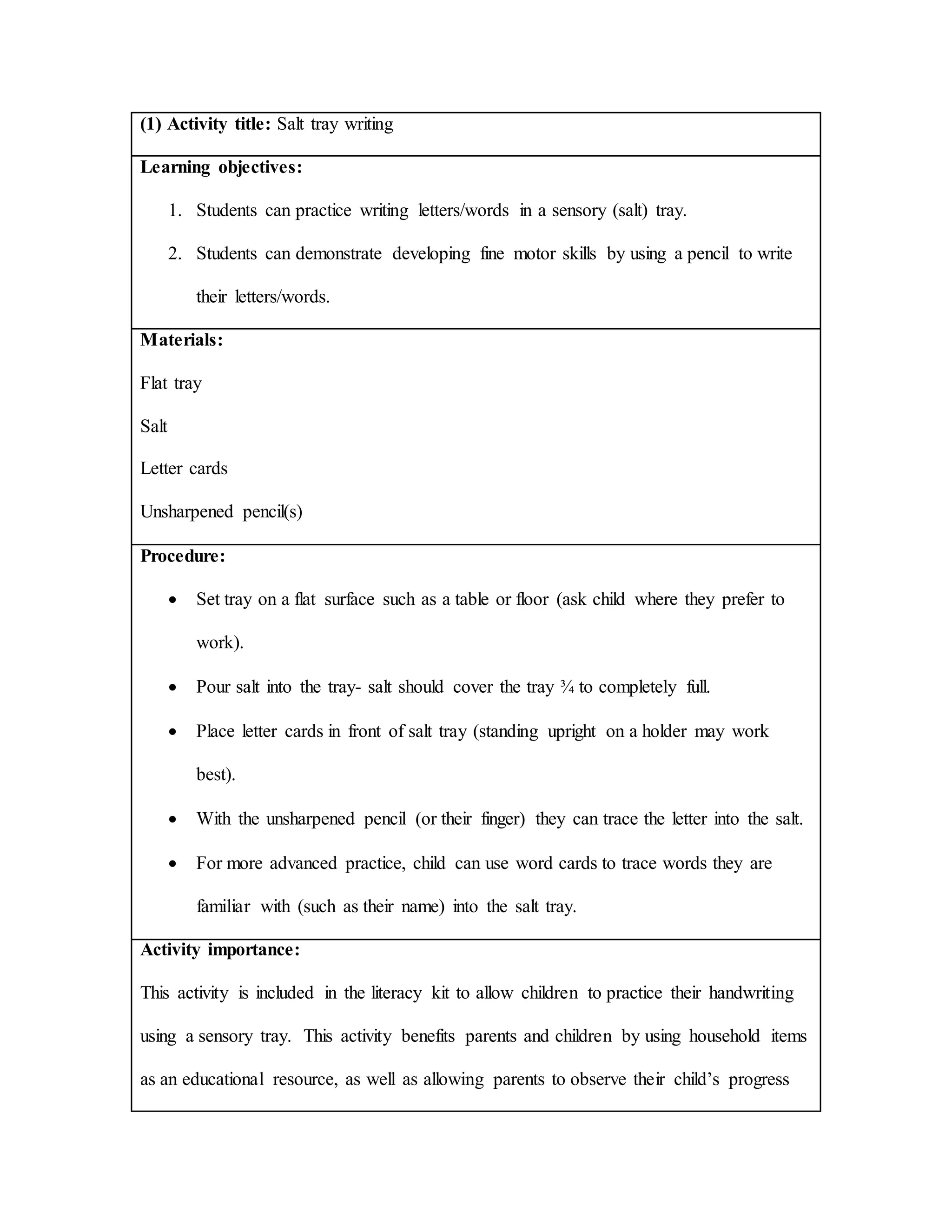 The document describes 10 literacy activities that can be done at home with children. Each activity is presented in its own section and includes the activity title, learning objectives, required materials, instructions and importance. The activities focus on skills like letter recognition, writing, making predictions, storytelling and integrating technology. Examples include name puzzles, picture walks, storytelling with objects in a bag, clapping syllables in words and using apps on devices. The document suggests packaging the activities and materials in a labeled cardboard or plastic box that families can browse, select from and return materials to.