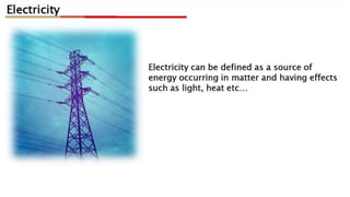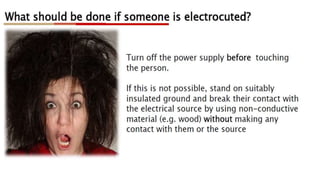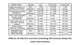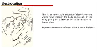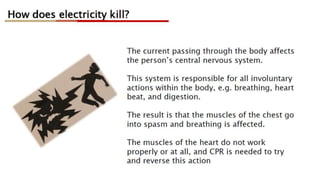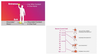This document discusses electrical safety and provisions according to Indian Electricity Rules 1956 and OSHA standards. It outlines key hazards of electricity including electric shocks, fires, explosions and injuries. The rules cover safety requirements for electrical equipment, installations, clearances, earthing and working on live lines. OSHA standards mandate de-energizing and locking out equipment before work. Objectives of safety measures are to prevent accidents through education, control of hazards and emergency response. Common electrical hazards include shocks from direct and indirect contact, falls, fires and release of toxic gases.