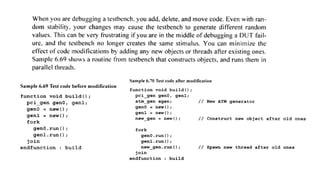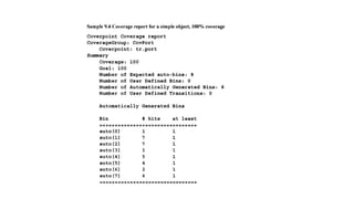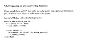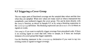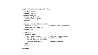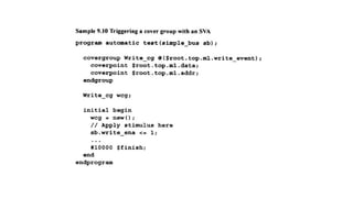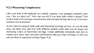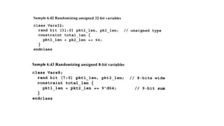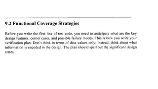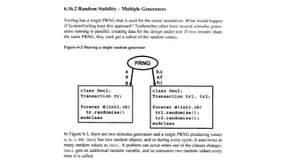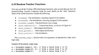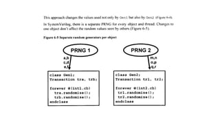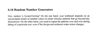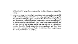 The document discusses the importance of randomization in testing digital designs, highlighting that traditional directed tests may miss bugs that random tests can uncover. It emphasizes various areas to randomize, such as device configurations, environmental conditions, and error handling in communication protocols. Additionally, it covers the use of SystemVerilog for creating random stimulus and the necessity of generating functional coverage to ensure thorough testing of design features.