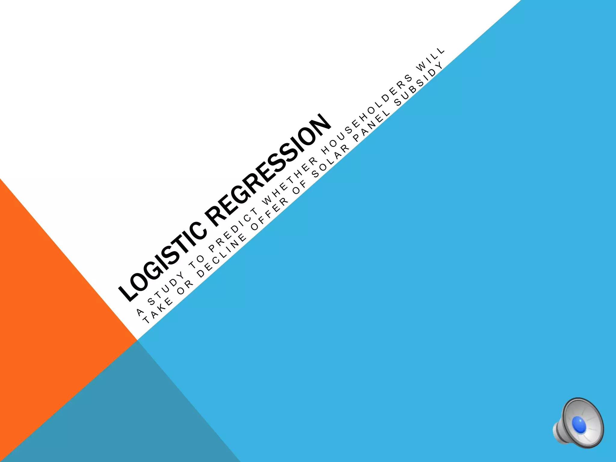 A logistic regression was conducted to predict if homeowners would accept or decline a solar panel offer based on household income and monthly mortgage. The full model was a good fit compared to the constant model. While the predictors were not individually significant, they correctly classified 83.3% of cases overall. Higher income was associated with higher odds of accepting the offer.
