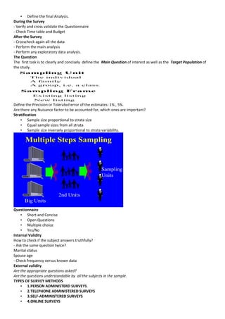 Survey research methods are used to collect large amounts of data using questionnaires. There are different types of surveys including samples, censuses, and polls. Key steps in conducting a survey include defining objectives and questions, choosing a sampling strategy, designing a questionnaire, collecting data, and analyzing results. Surveys can be conducted in various ways such as in-person, by telephone, self-administered, or online. It is important to minimize errors and ensure surveys are accurate, unbiased, and generalizable.