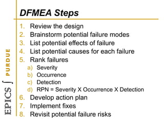 The document outlines the Design Failure Mode and Effects Analysis (DFMEA) process, detailing steps such as reviewing design, identifying potential failure modes and their causes, ranking failures, and developing action plans to address them. Additionally, it emphasizes the importance of testing designs through various methods to ensure functionality and safety, highlighting the creation of test plans and the significance of prototyping. The document concludes with a focus on effective project delivery and the review process needed for successful implementation.