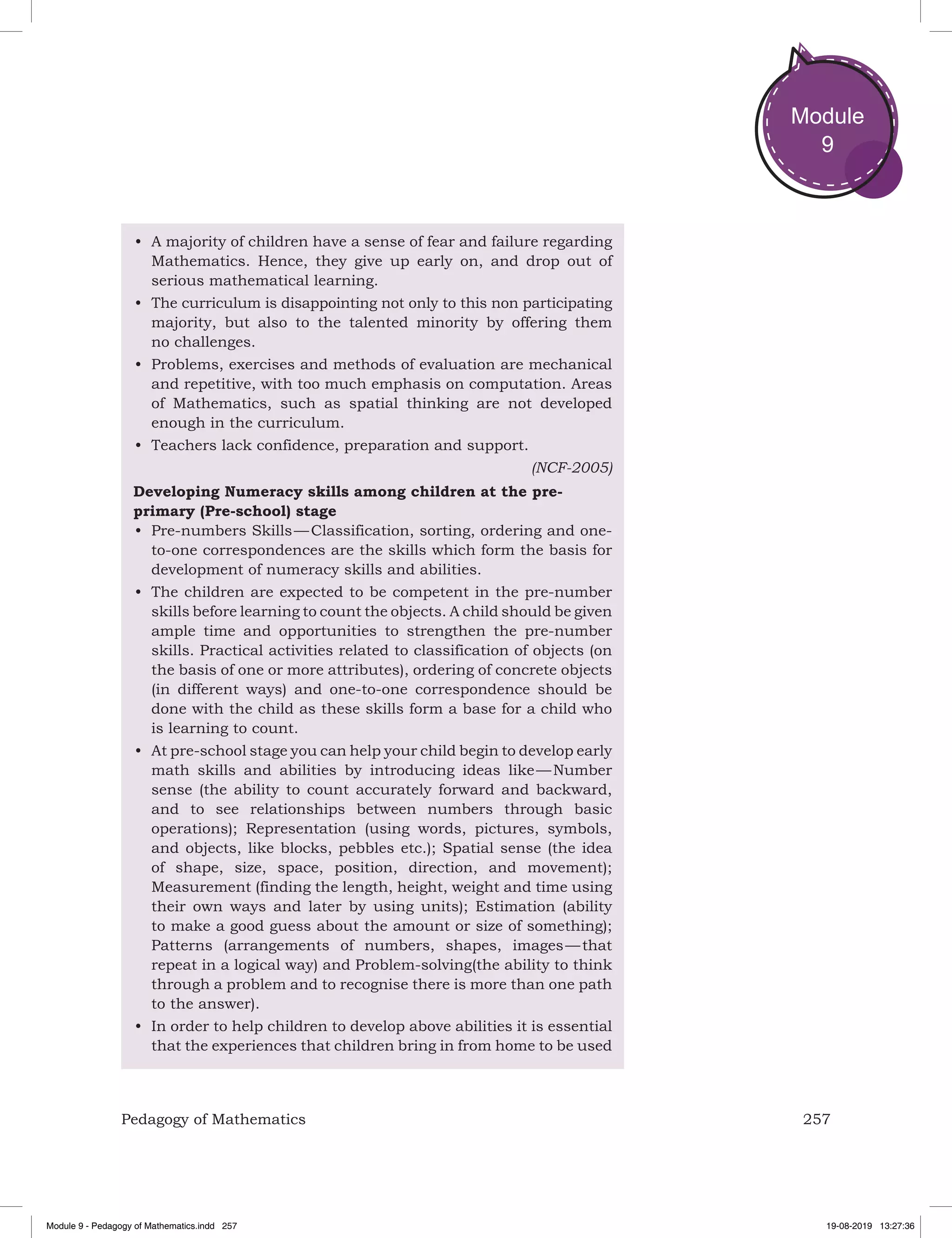 This document discusses pedagogy of mathematics at the primary level. It emphasizes developing numeracy skills in a stress-free environment through learner-friendly methods. At the primary level, teaching mathematics requires expertise in both subject knowledge and skills. Lessons should focus on engaging children through manipulation of concrete objects. A sequence of providing experiences, developing language skills, pictorial representation, use of symbols, and integrating other subjects is recommended. At the upper primary level, mathematics requires balancing abstract concepts and real-life contexts. Teachers must use participatory methods like problem-posing and -solving to make mathematics enjoyable.