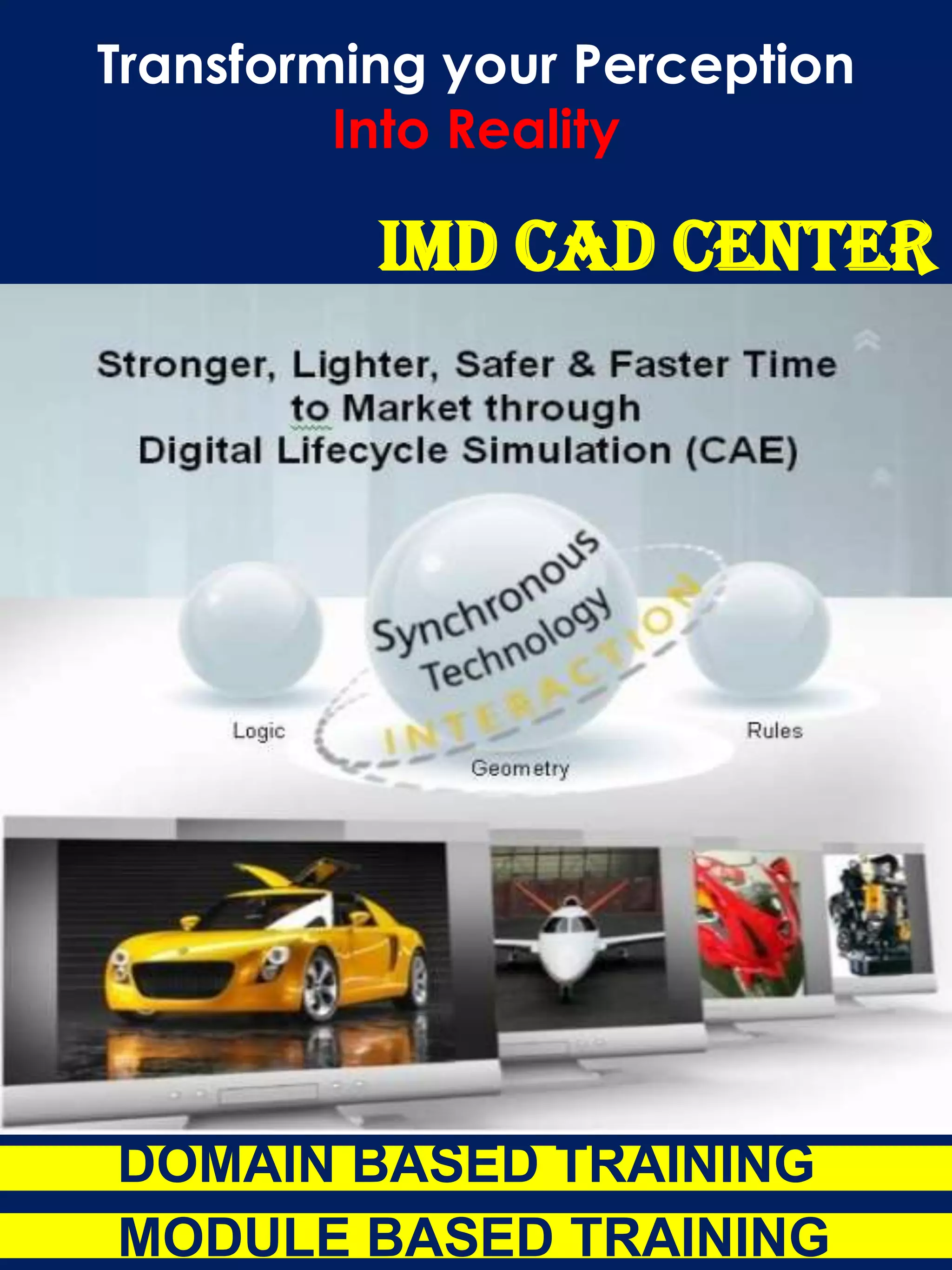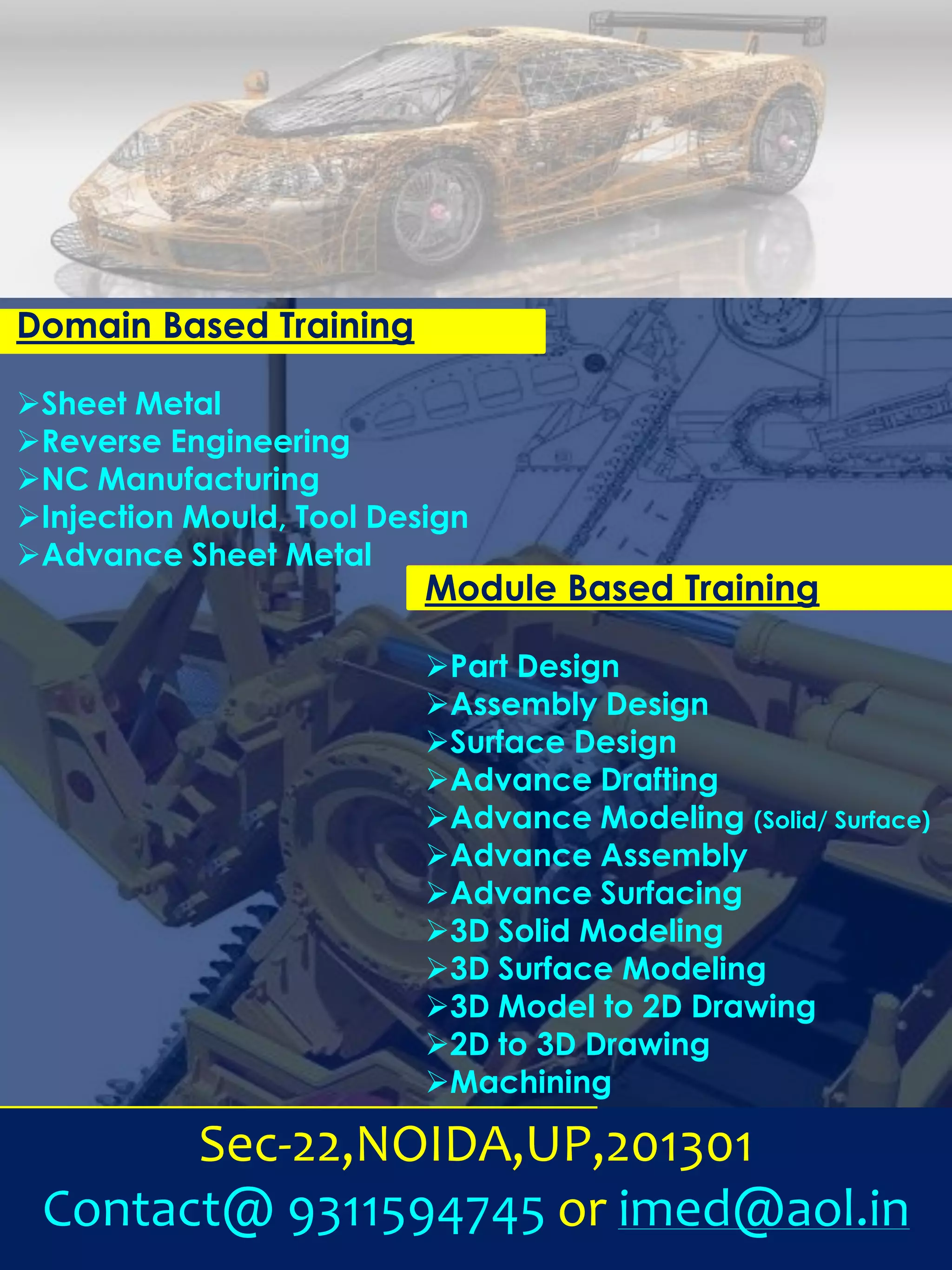 This document describes training programs offered by IMD CAD Center in Noida, India. The training is divided into domain-based and module-based formats. Domain-based training covers topics like sheet metal, reverse engineering, NC manufacturing, injection mould and tool design, and advanced sheet metal. Module-based training covers specific CAD skills like part design, assembly design, surface design, advanced drafting, modeling, assembly, surfacing, 3D solid modeling, 3D surface modeling, converting 3D models to 2D drawings, and machining. The training center is located in Sector 22, Noida, Uttar Pradesh, India and can be contacted via phone or email.