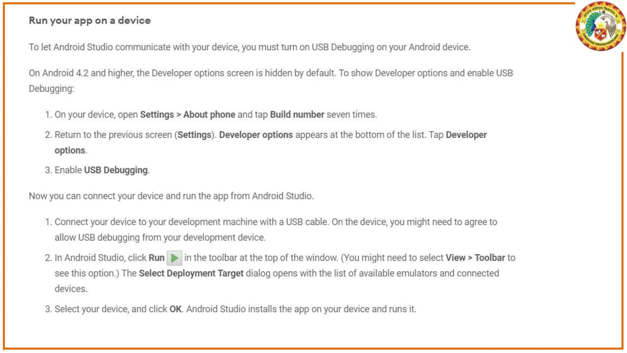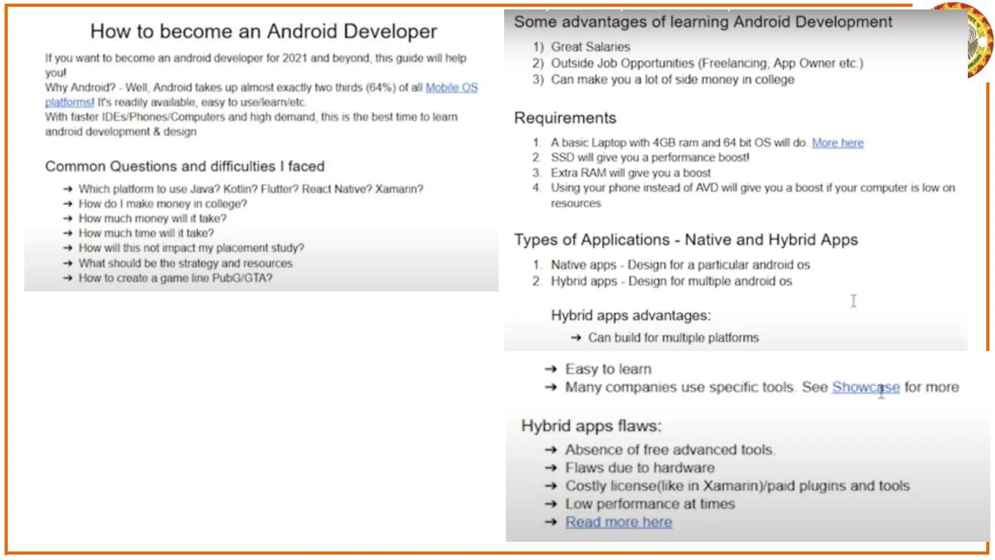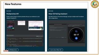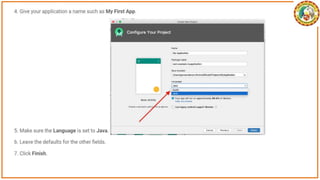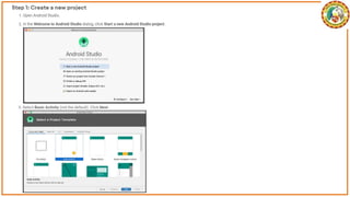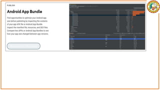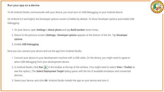 The document discusses the development of Android apps using Android Studio, including features and tools for coding, debugging, and testing. It outlines installation prerequisites such as Java JDK and provides a step-by-step guide for creating a simple 'Hello World' app. The document also covers troubleshooting common issues with Android Studio and device recognition.