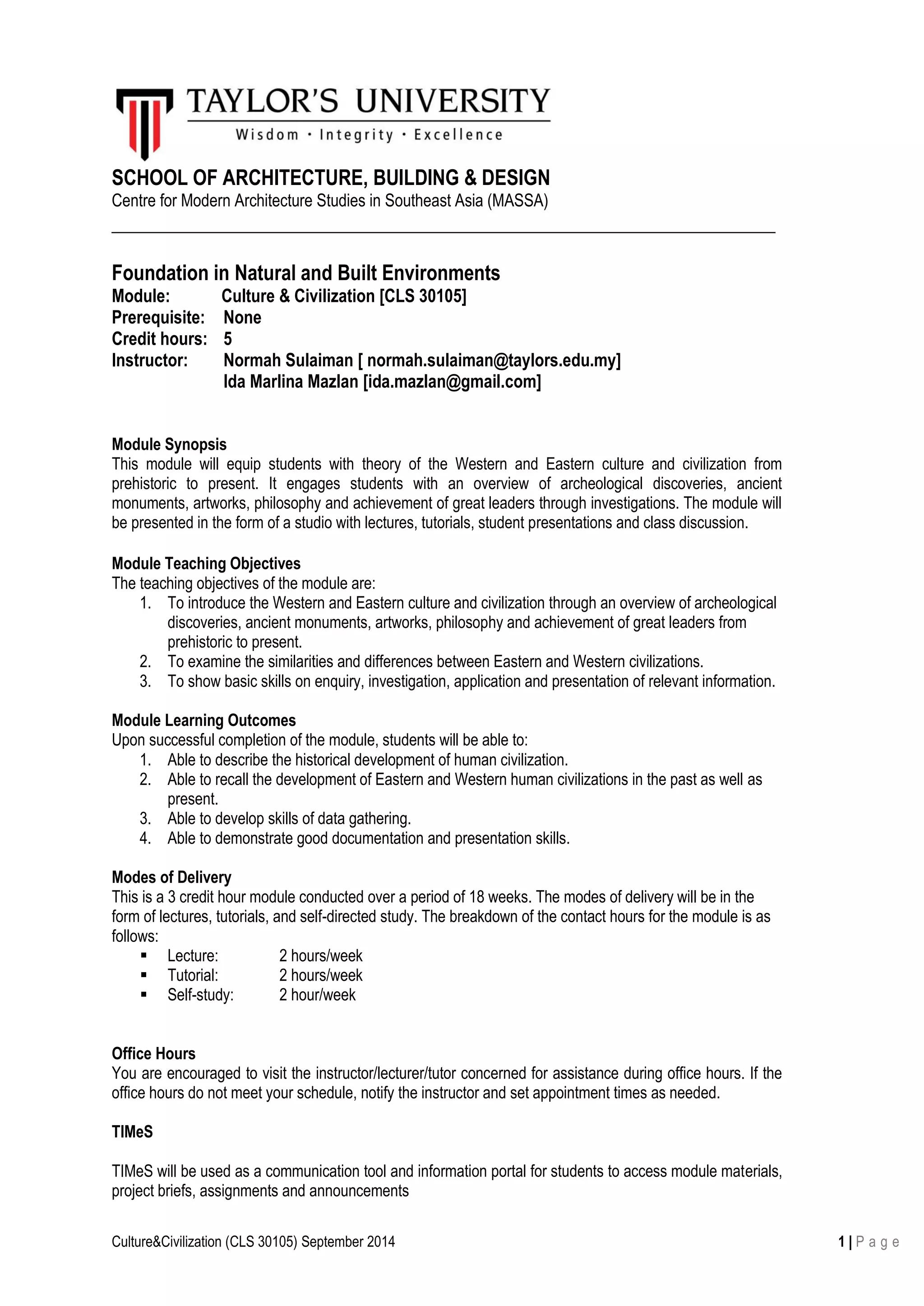This document provides an overview of the Culture & Civilization module offered at Taylor's University. The module aims to equip students with an understanding of Western and Eastern cultures from prehistoric times to the present through lectures, tutorials, student presentations and class discussions. It will introduce major archaeological discoveries, ancient monuments, artworks, philosophies and leaders. Students will compare Eastern and Western civilizations and develop skills in research, investigation, application and presentation. Assessment includes individual and group projects, presentations, and an e-portfolio demonstrating knowledge and skills gained from the module. The module runs for 18 weeks with lectures, tutorials and self-directed study.