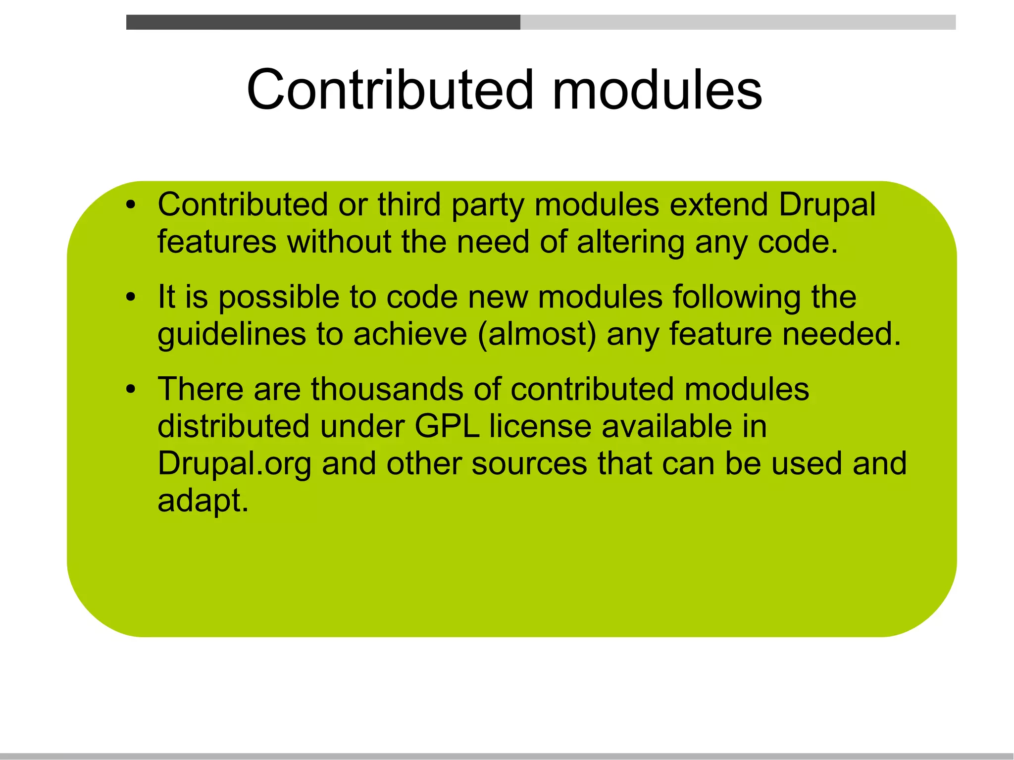 Contributed modules extend Drupal's functionality without code changes. The main source is Drupal.org, which hosts thousands of free, GPL-licensed modules. Modules should be chosen based on usage stats, issues, and reviews. They are installed by downloading, extracting, and placing them in sites/all/modules. Enabling modules on the Modules page activates their functionality. Popular modules include Views for listings, Rules for workflows, Pathauto/Token for SEO-friendly URLs, and Panels for custom page structures.