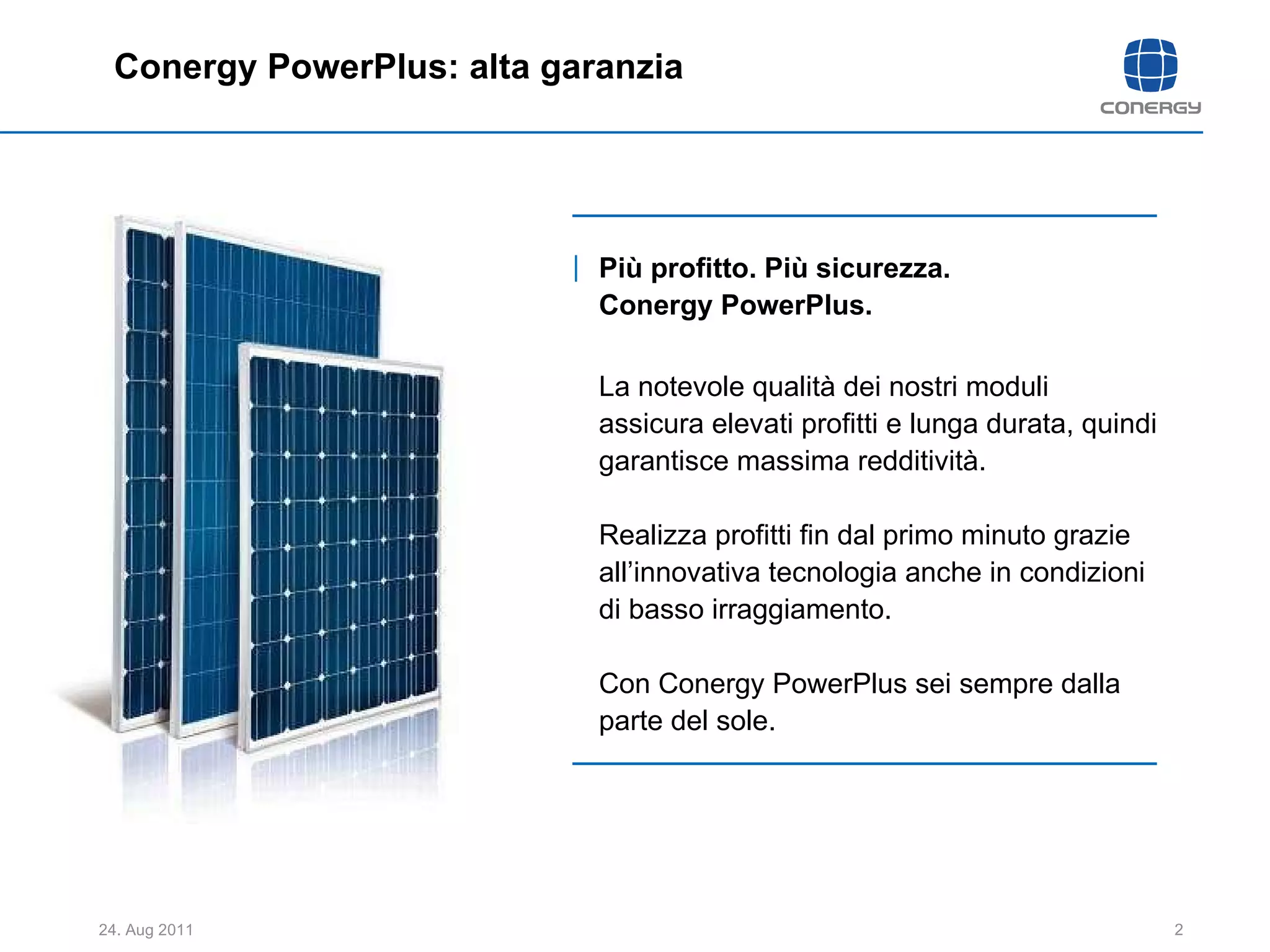 I moduli fotovoltaici Conergy PowerPlus offrono alta garanzia e redditività grazie alla loro resistenza e performance superiori, anche in condizioni di bassa illuminazione. La produzione automatizzata assicura qualità e facilita l'installazione, mentre le certificazioni garantiscono conformità ai requisiti normativi per ottenere incentivi. Conergy, con una rigida garanzia di qualità, offre una vasta gamma di moduli ad alta efficienza e prezzi competitivi.