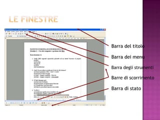 Il documento tratta l'uso delle finestre e la gestione di file e cartelle, evidenziando le diverse barre presenti in un'interfaccia Windows e le operazioni che si possono eseguire su di esse. Vengono descritte le modalità per creare, rinominare e selezionare file e cartelle, oltre alle funzioni del cestino e dello strumento di ricerca. Inoltre, il documento illustra come ridimensionare, spostare e copiare file, enfatizzando l'importanza di mantenere un sistema organizzato.