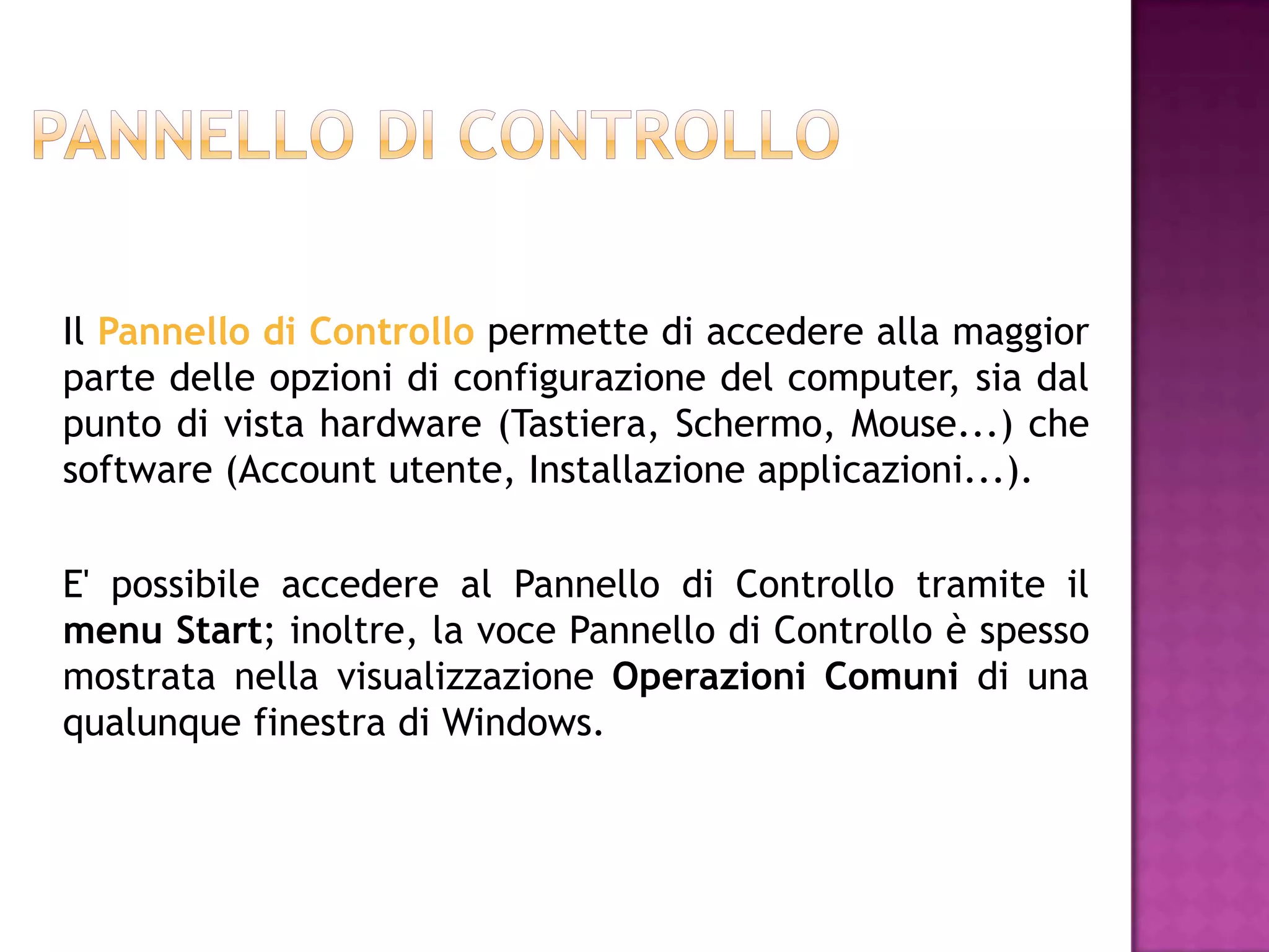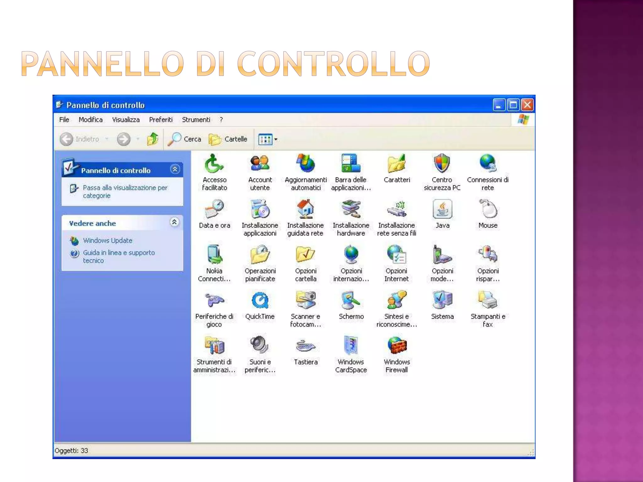 Il documento tratta il pannello di controllo di Windows, evidenziando come accedervi e modificare varie impostazioni di sistema, tra cui hardware, software e gestione delle stampanti. Viene spiegato come comprimere file e cartelle, e l'importanza di avere un software antivirus per proteggere il computer da virus informatici. Infine, il testo illustra funzioni come la gestione delle stampanti e delle impostazioni audio.