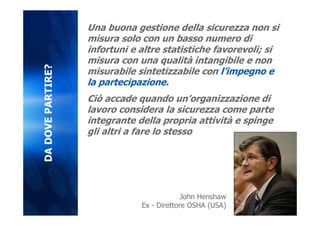 La sicurezza sul lavoro deve essere vista come un valore integrato nell'organizzazione piuttosto che come una semplice priorità misurabile attraverso statistiche. La prevenzione degli infortuni dipende dall'impegno del management e dalla responsabilità collettiva, promuovendo una cultura di sicurezza positiva. Investire tempo e risorse nella prevenzione è fondamentale per affrontare le cause profonde degli incidenti anziché limitarsi a soluzioni superficiali.